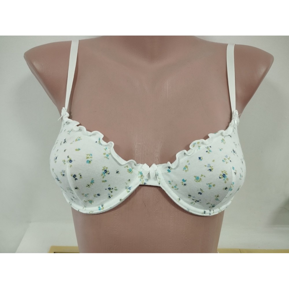 Бюстгальтер торговой марки Atlantic с мягкими чашками на косточках выполнен из высококачественного хлопка белого цвета в мелкий цветочный принт темно-синего, голубого и зеленого цветов;