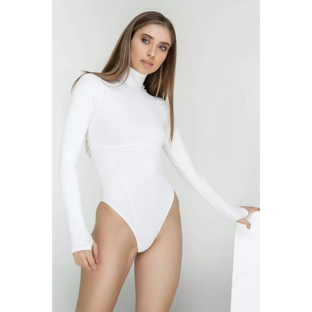 Крій виробу має гарну посадку завдяки чому не приноситиме дискомфорт. Довгий рукав із фіксацією на пальчику. Високе горло. Рельєфна кокетка, саме цей рельєф вигідно підкреслить груди. Також по всьому боді можна побачити рельєфні шви, вони формують облягаючий силует, забезпечують ідеальну посадку виробу по фігурі, делікатно повторюють природні вигини тіла. Застібка внизу на кнопках у два ряди. Весь виріб виконаний у технології “плоский шов”.