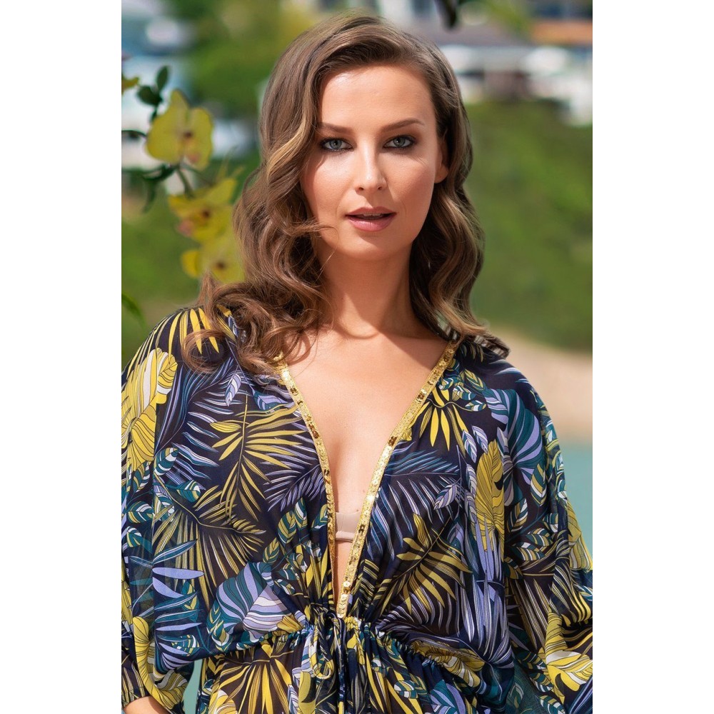 Довга пляжна туніка "Коста Брава" 8860 від Mia-Amore виготовлена ​​з шифону. Туніка регулюється за допомогою куліси. Передня поличка вироби декорована тонкою лінією паєток. Склад: 100% поліестер