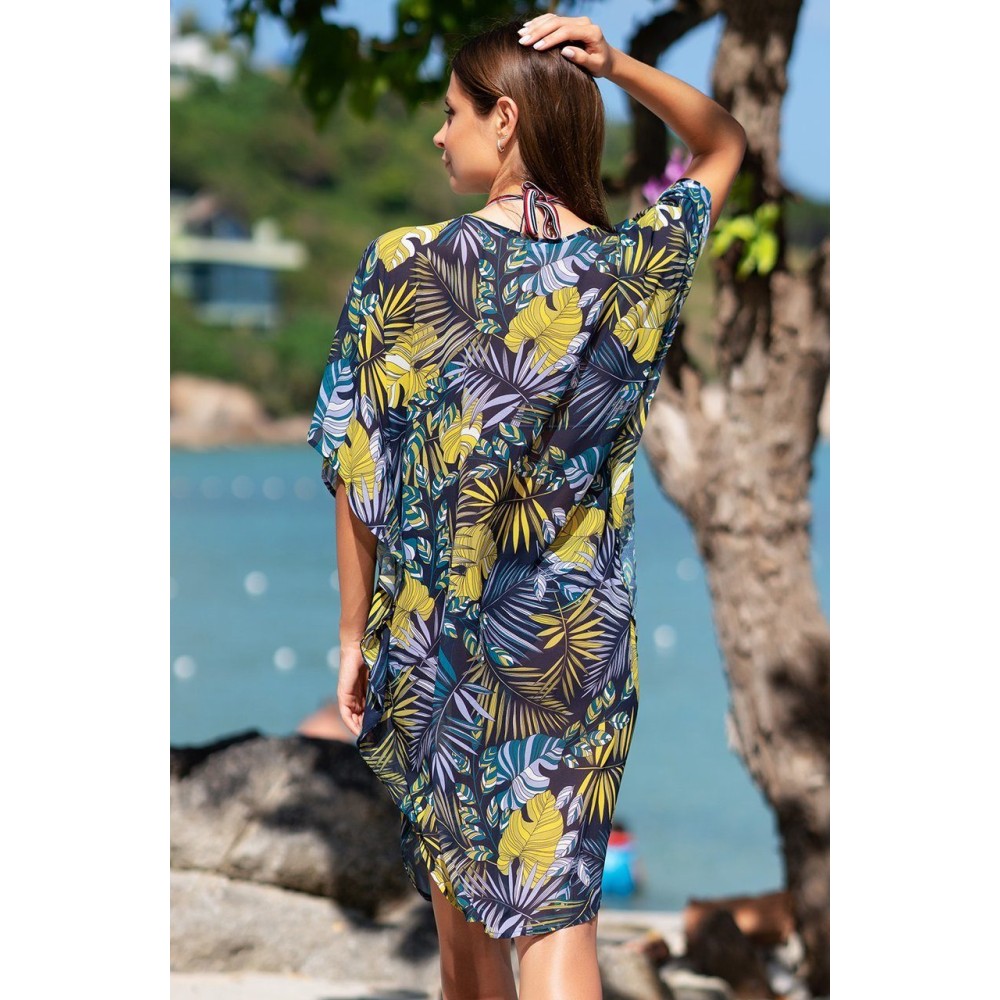 Жіноча пляжна туніка "Коста Брава" 8864 від Mia-Amore виготовлена ​​з шифону з оригінальним рослинним принтом. Туніка до колін, V-подібний виріз горловини декорований бісером в колір вироби. Склад: 100% поліестер.