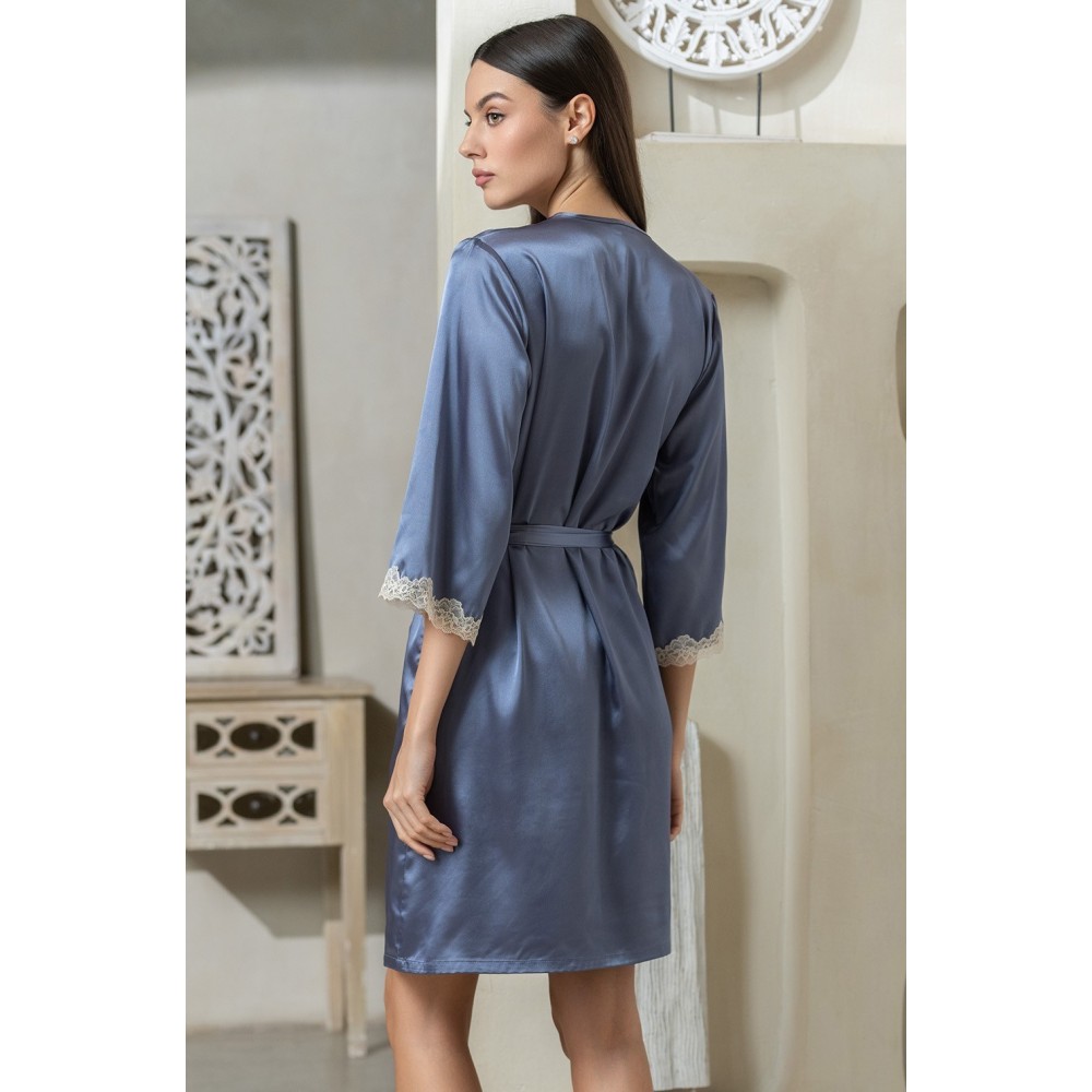 Короткий халат "Джулія" 8733-4 Mia-Mella з рукавами 3/4 виготовлений зі штучного шовкового полотна з атласним блиском. Рукави та борти халату декоровані витонченим мереживом. Халат на запаху з поясом, у бічних швах є кишені.Склад 100% поліестер