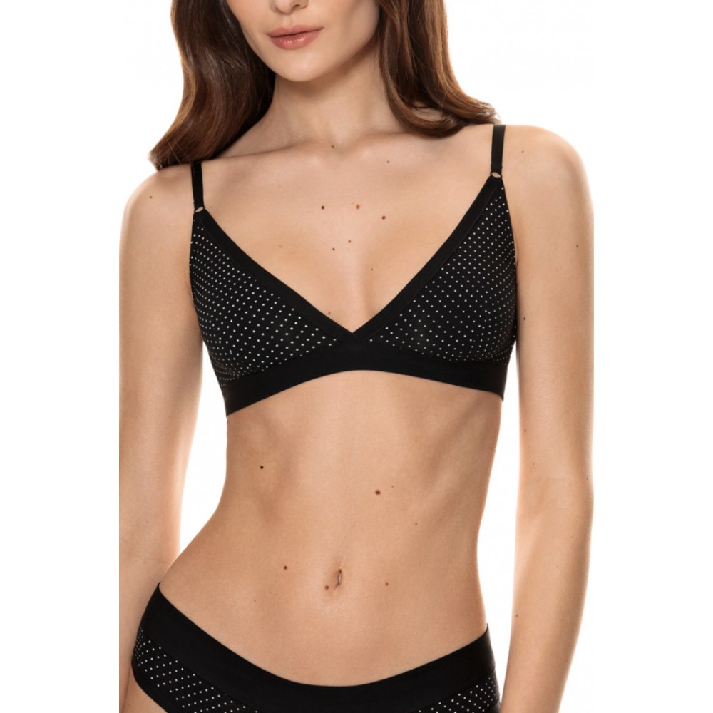 Бюстгальтер типа бралетт торговой марки Jasmine выполнен из качественного хлопка черного цвета в мелкий горошек белого цвета;