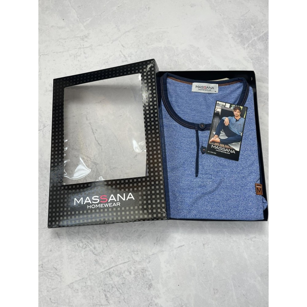 Чоловіча піжамаMassana P231335 складається з футболки з довгими рукавами, круглим вирізомгорловини та вирізом. Довгі штани з регульованою талією.Склад: 50%віскоза, 50% поліестер.