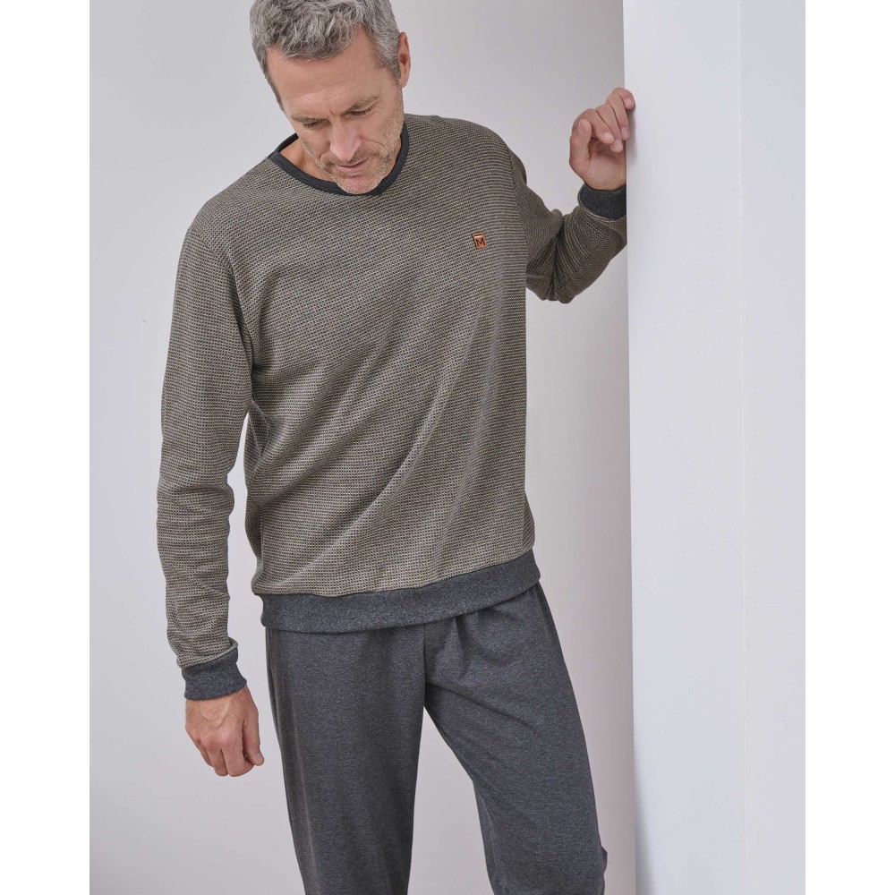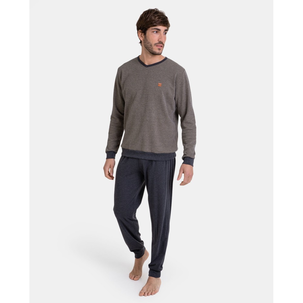 Чоловіча піжама збрюками Massana P731339 виготовлена ​​з бавовняної тканини. Комплектскладається з кофти з довгим рукавом, манжети та нижня честь декоровані сіроютканиною у тон штанів. Штани однотонні прямого крою.Склад: 50%бавовна, 50% поліестер.