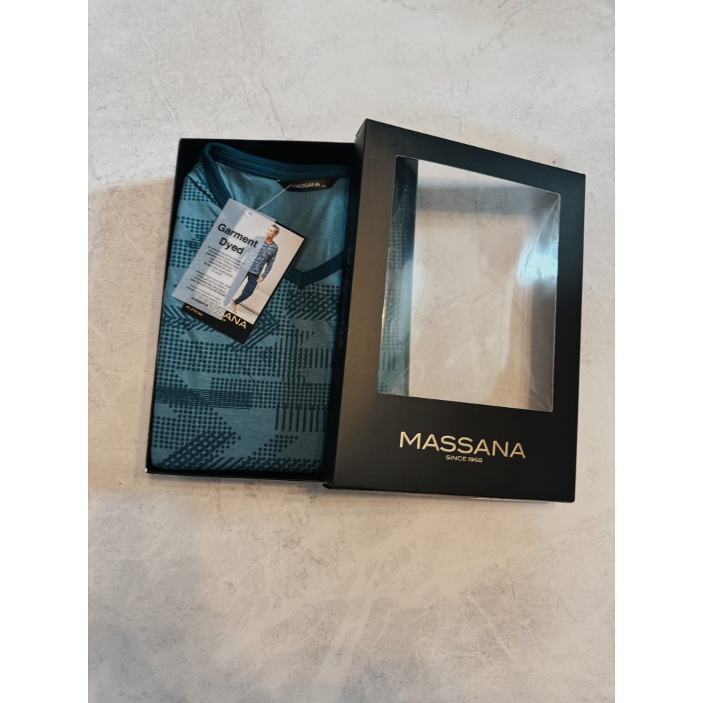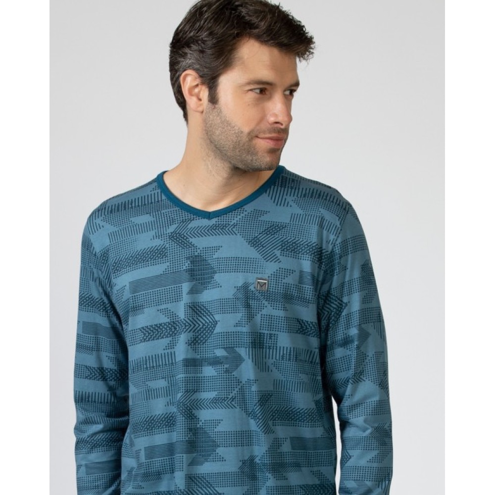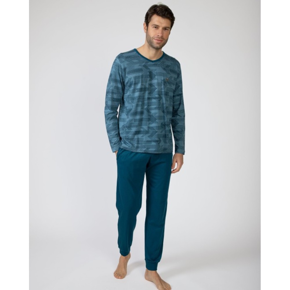 Чоловіча піжамазі штанами Massana P751303 виготовлена ​​з високоякісного 100% бавовняноготрикотажу. Комплект складається з джемпера з довгими рукавами, принтом по всійповерхні та V-подібним вирізом. Штани однотонні на гумці в поясі, низ зманжетами, з боків розташовані кишені.Склад: 100%бавовна.