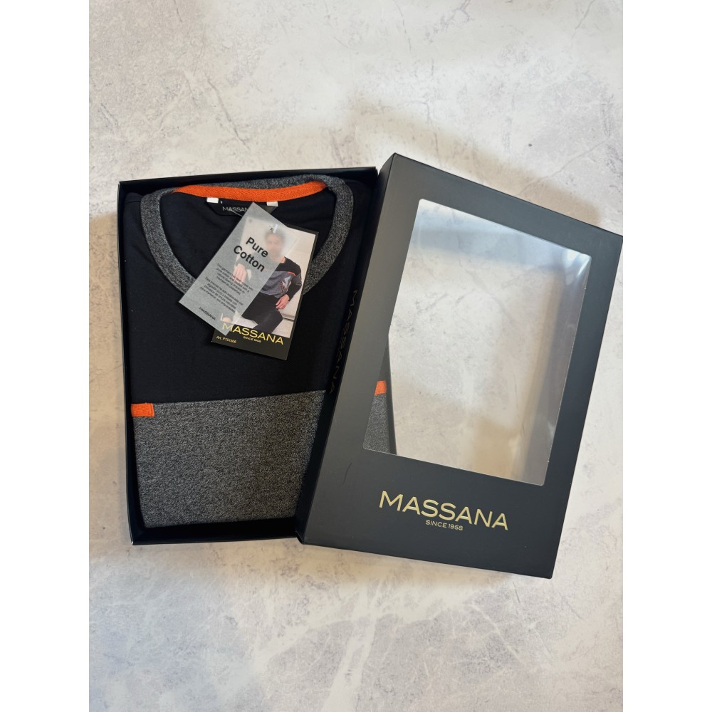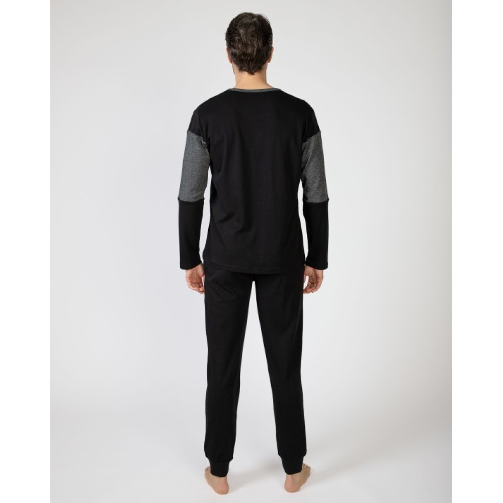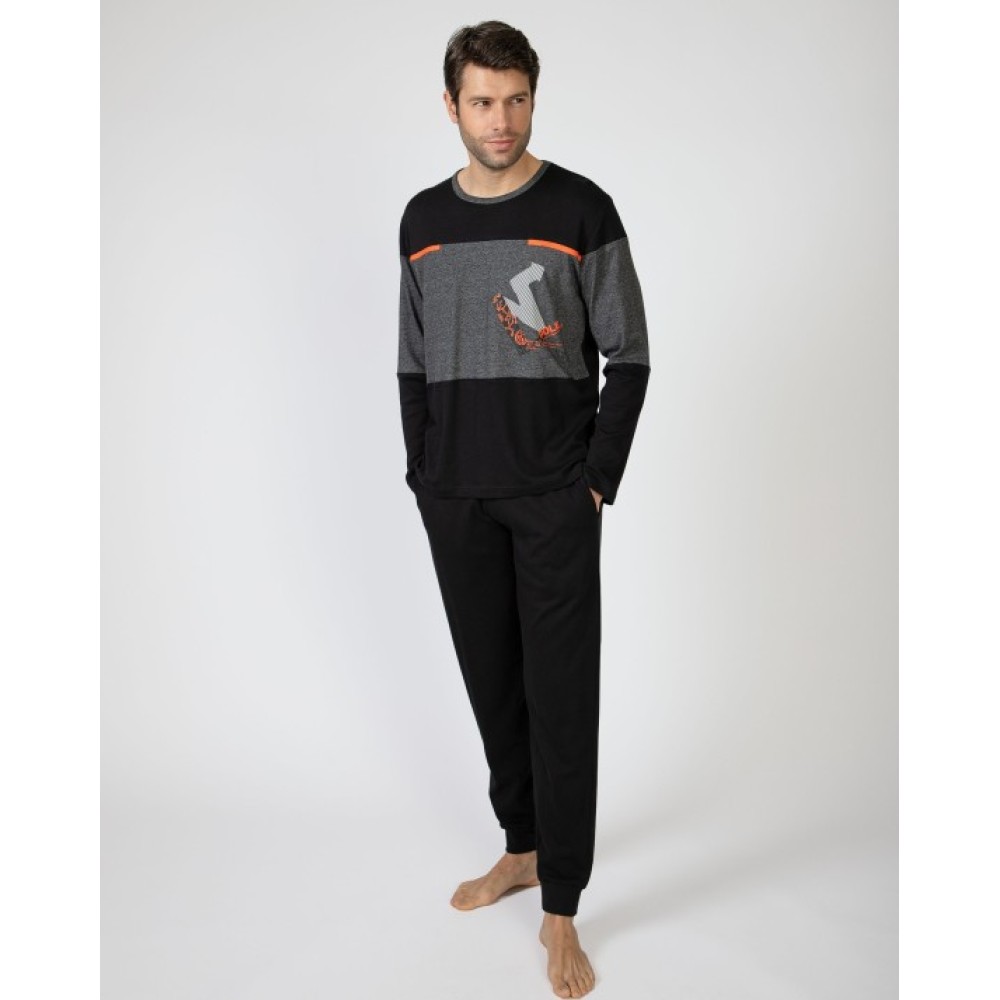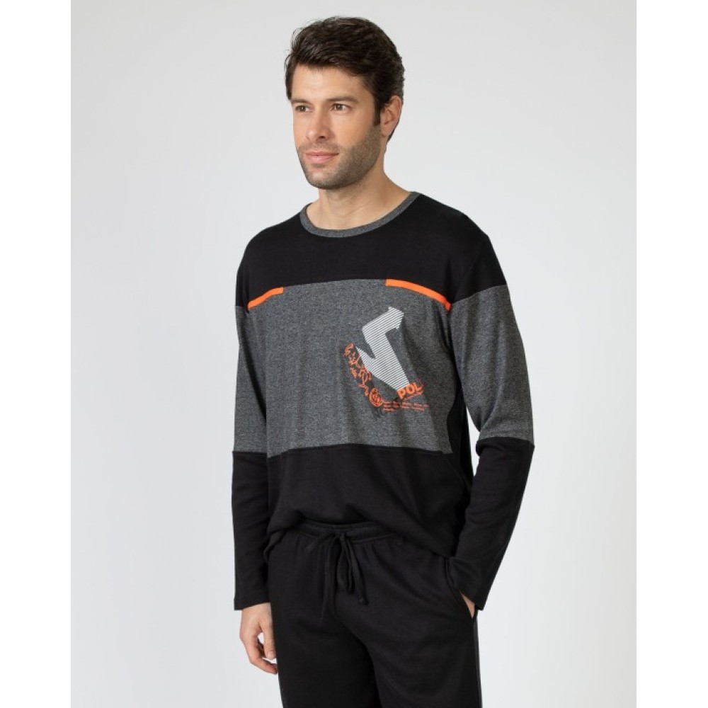 Чоловіча піжамадля дому та відпочинку Massana P751306 із 100% високоякісного бавовняноготрикотажу. Комплект складається з джемпера з довгими рукавами та принтом,круглим вирізом горловини та контрастними вставками на рукавах та спереду.Штани з манжетами, бічними кишенями та еластичним поясом.Склад: 100%бавовна.