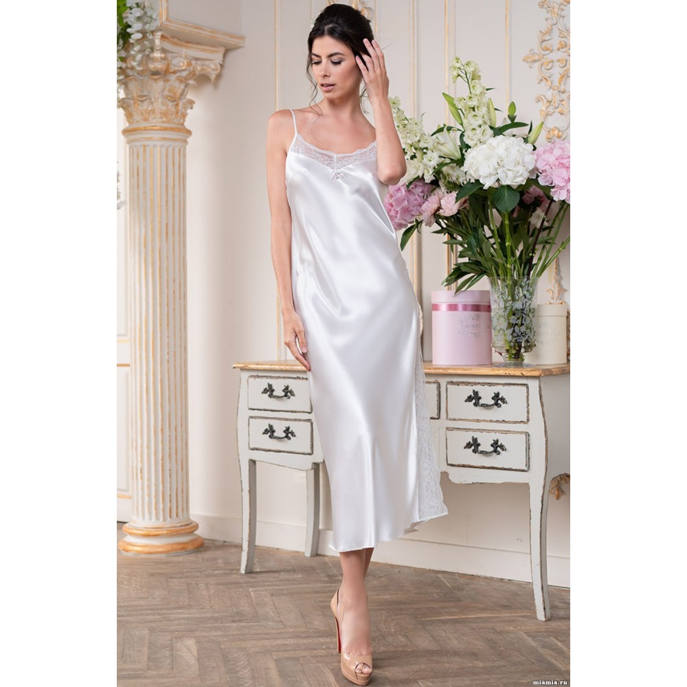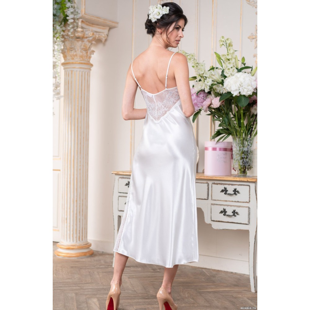 Довга сорочка "Крістіна" 8898 Mia-Amore з витачкамі на тонких бретелях виконана зі штучного шовку. Ліф сорочки, спинку і високий розріз збоку прикрашає широке м'яке мереживо з тонкою срібною ниткою. Спереду на ліфі бантик зі срібною підвіскою. Склад 100% поліестер