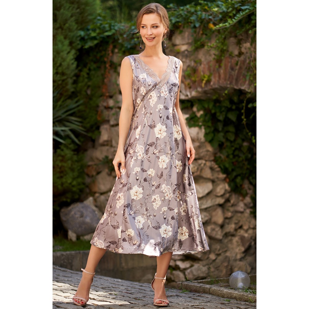 Довга сорочка Грація 3588 від Mia-Amore з V-подібнимвирізом, виготовлена ​​з принтованого шовку. Виріз сорочки декорований ажурниммереживом. Ліф прикрашений бантиком із підвіскою.Склад 70% натуральний шовк, 25% поліестер, 5% еластан.