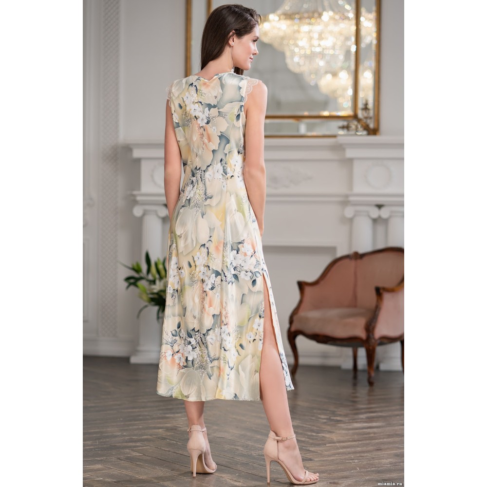 Довга сорочка "Лучіаном" 3538 Mia-Amore з рельєфами виконана з принтованого смесового шовкового полотна. Виріз горловини спереду і плечі сорочки прикрашає обробка з вишівного мережива. По центру ліфа розташований декоративний бантик. Склад 70% натуральний шовк, 25% поліестер, 5% еластан