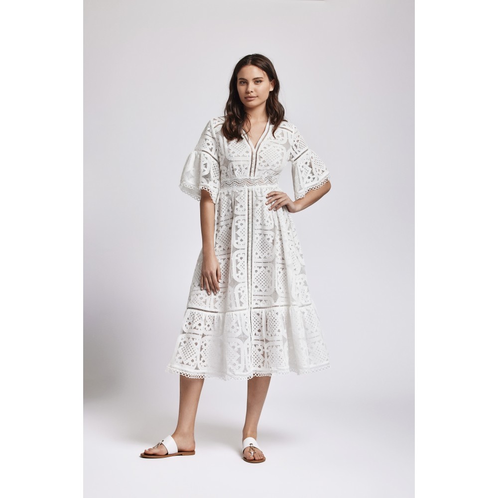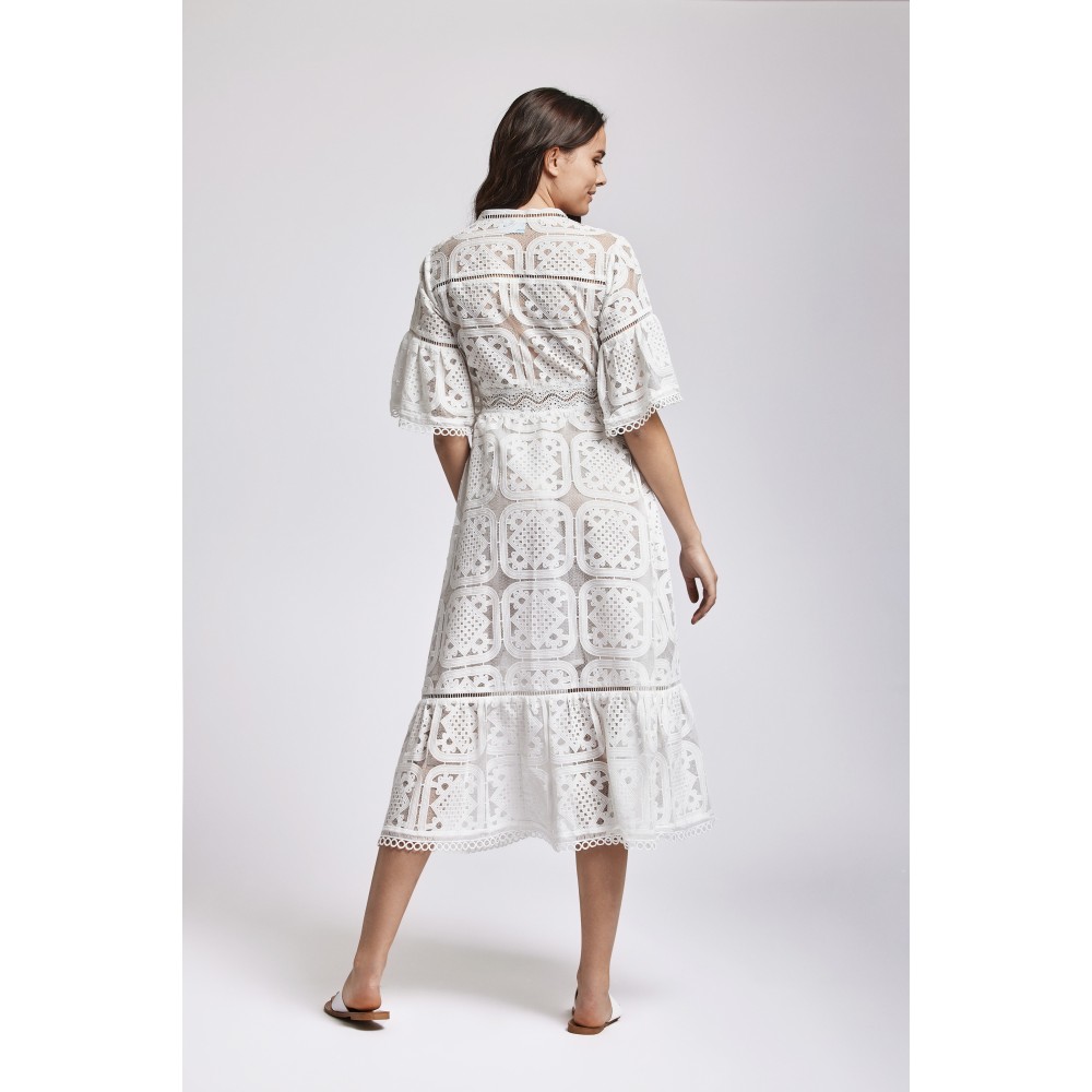 Довга літня сукня Iconique IC24-005 із змішаної бавовнидекорована вишивкою, краї рукавів та нижня частина виробу прикрашені рюшами.Горловина має V-подібний виріз. Довжина рукава 3/4Склад: Поліестер 60%, бавовна 40%.