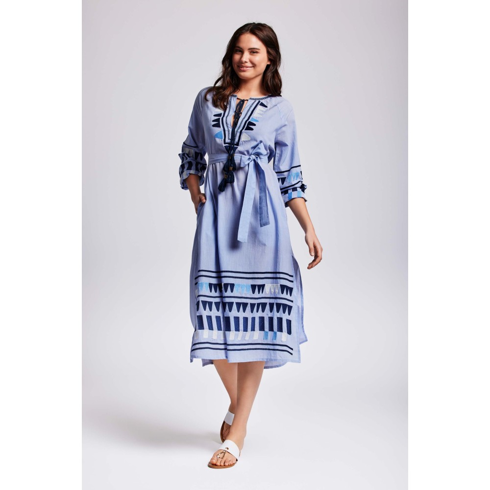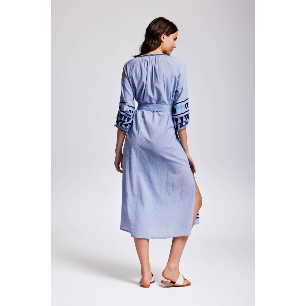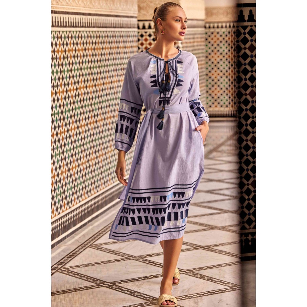Довга літня сукня Iconique IC24-044 виготовлена ​​звисокоякісної бавовни. Довгий рукав, горловина має округлу форму із зав'язкамиз пензликами. Лінія талії регулюється поясом. З боків розташовані кишені.Склад: 100% бавовна.