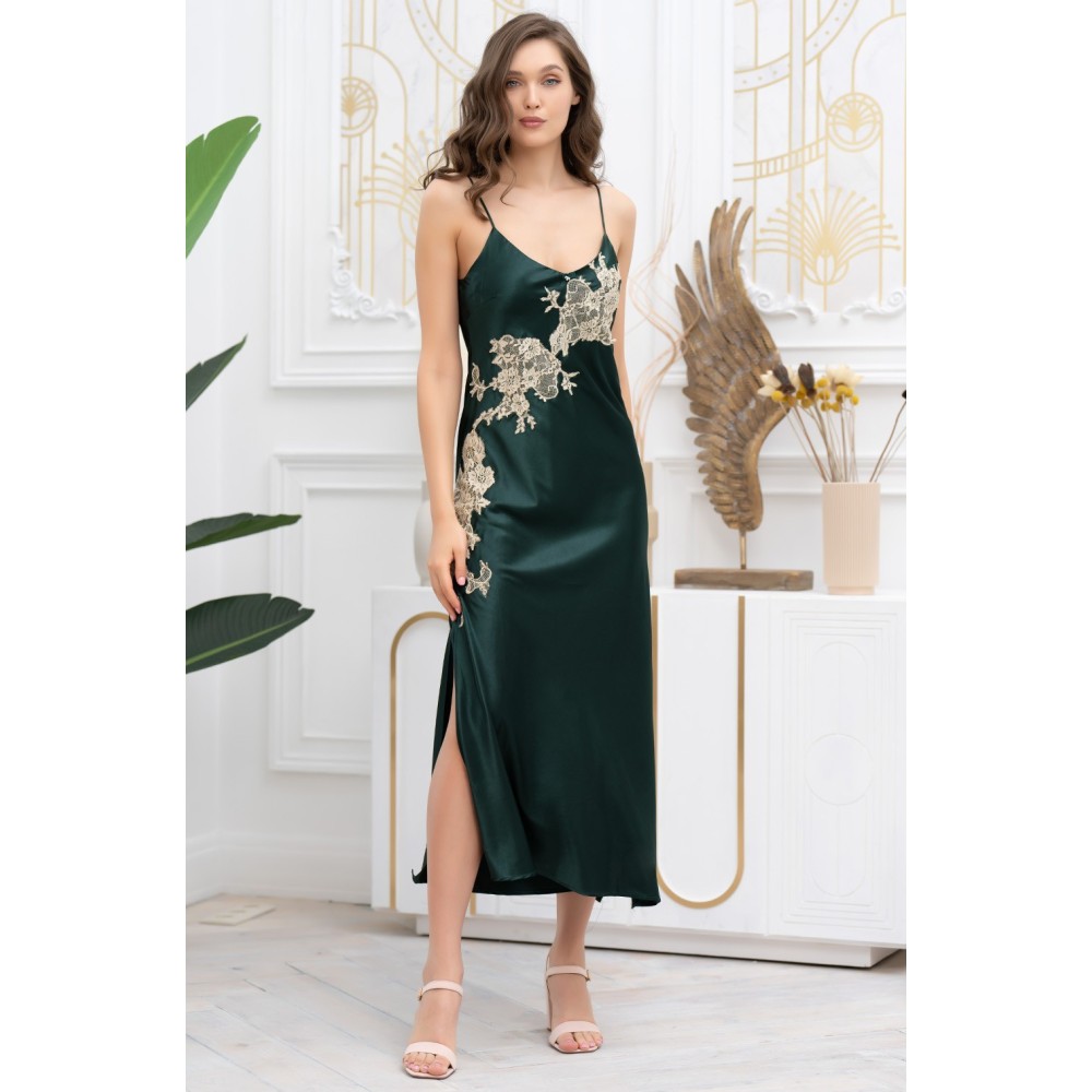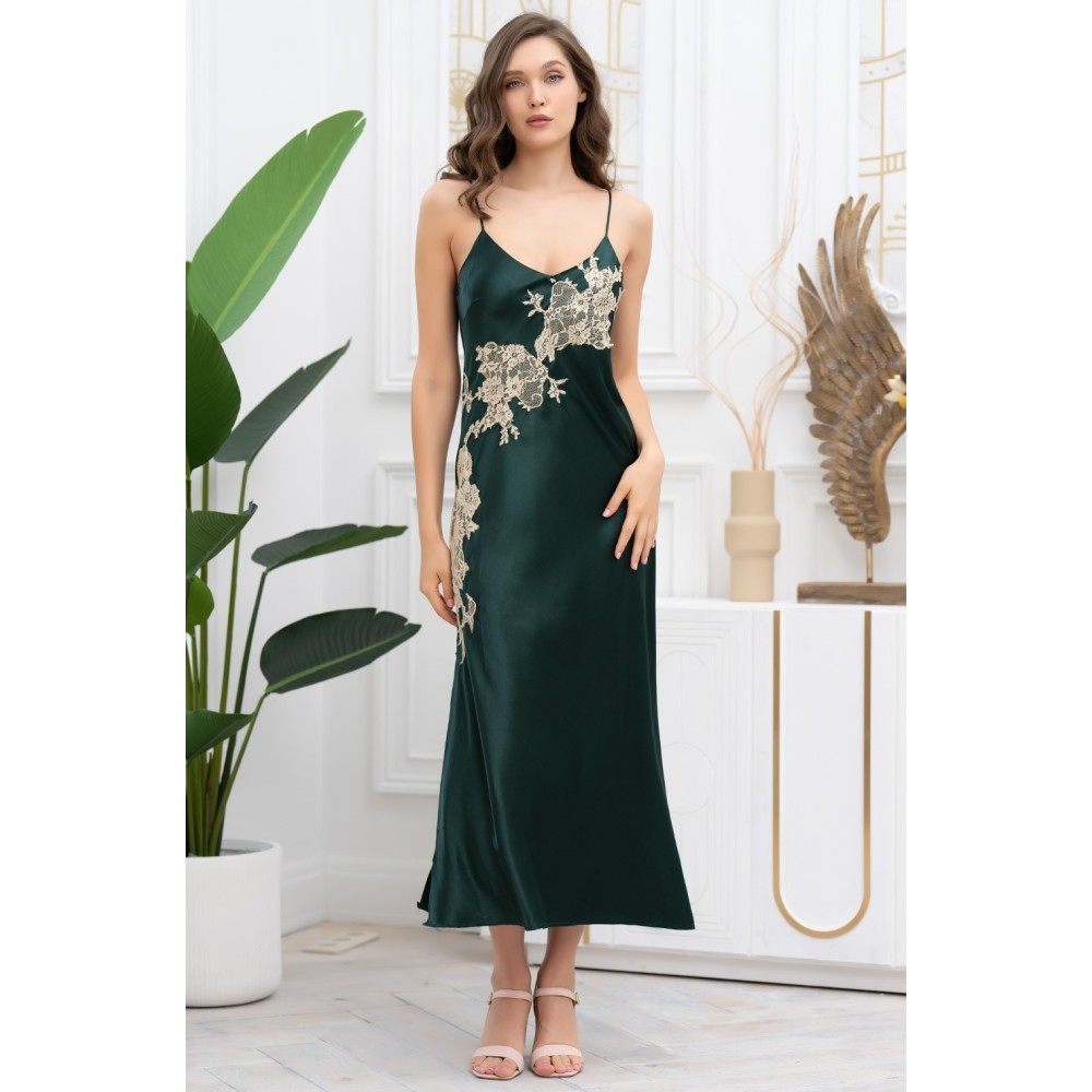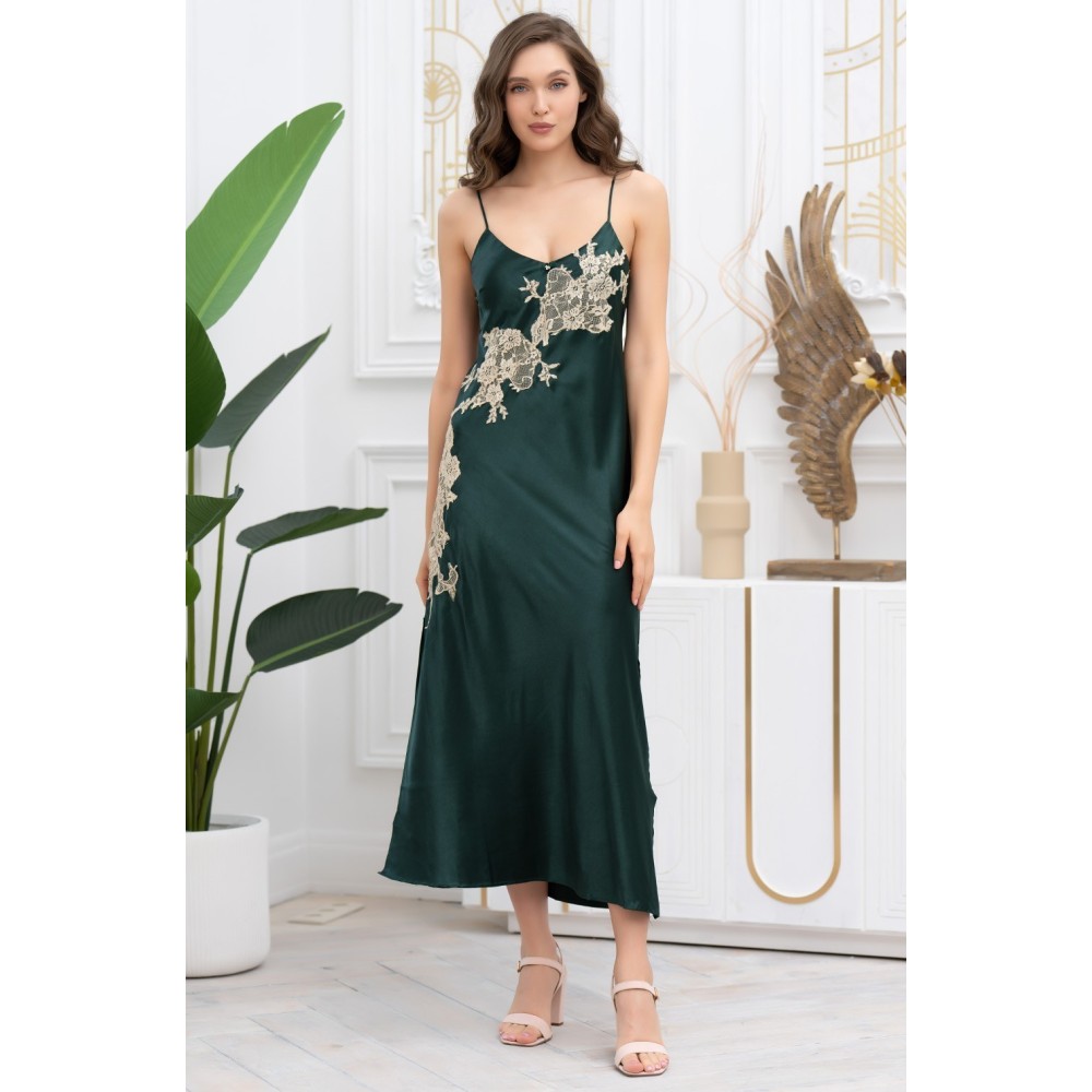 Довга сорочкаФелліні 3918 від Mia-Amore на тонких бретелях виконана із сумішевого шовку.Передня частина сорочки прикрашена мереживними вставками, розсипаними по шовкуажурними бутонами. Збоку сорочки ефектний розріз.Склад 70%натуральний шовк, 25% поліестер, 5% еластан.