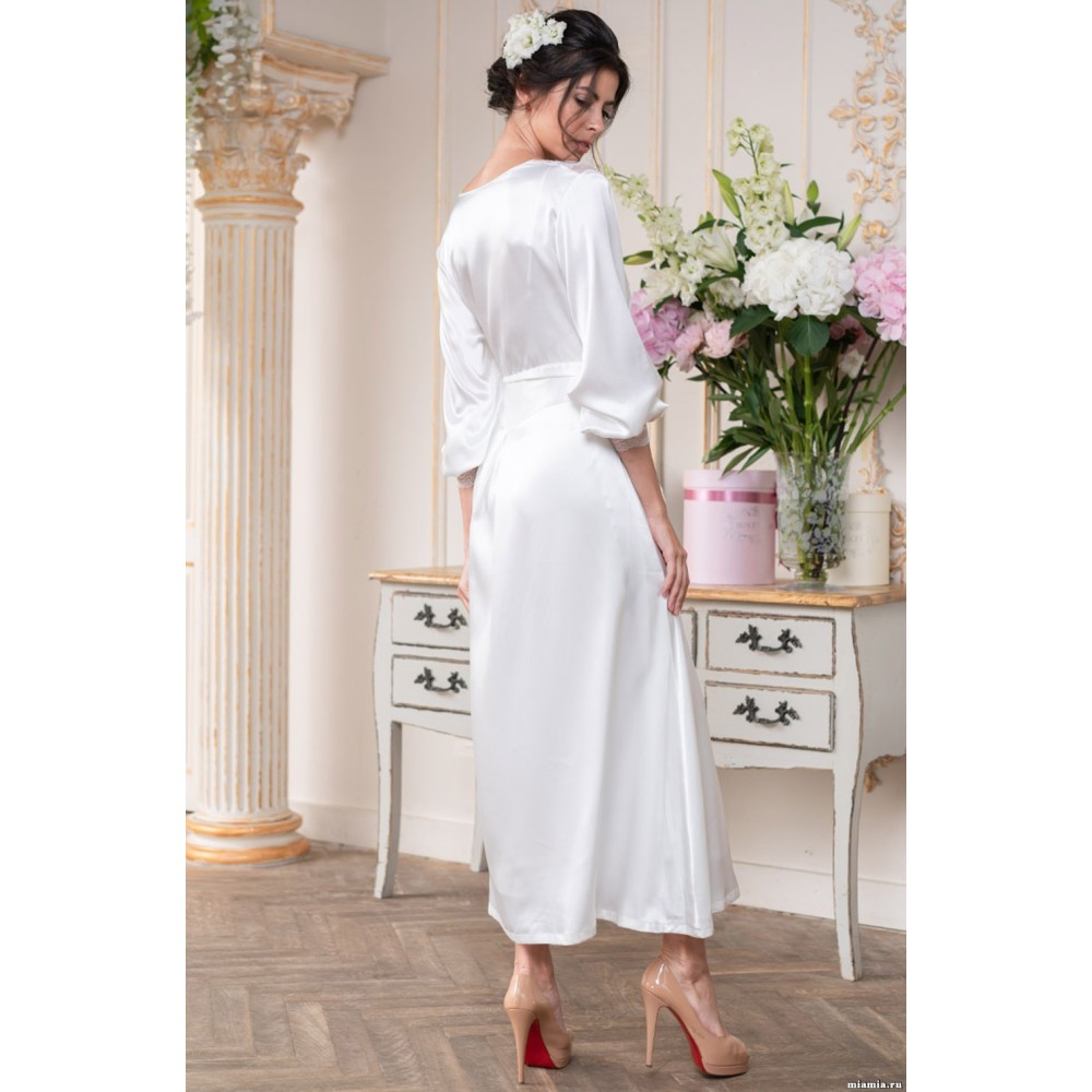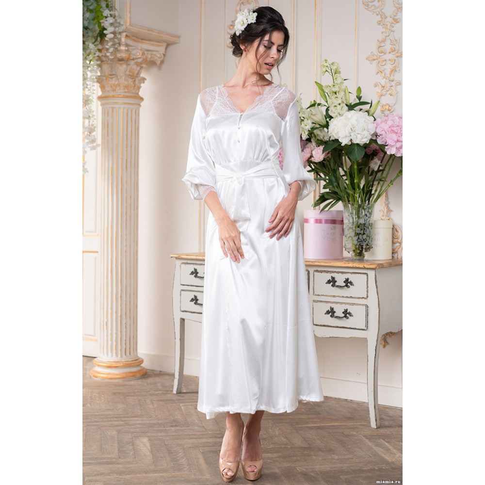 Довгий халат "Христина" 8899 Mia-Amore з центральною застібкою ліфа на чотири гудзики, з рукавами-ліхтариками з витонченими манжетами з мережива виконаний зі штучного шовку. На спинці отрезная нижня частина з глибокої складкою. Виріз горловини спереду прикрашає широке м'яке мереживо з тонкою срібною ниткою. У бічних швах кишені. За талії халат затягується широким поясом, який утворює при зав'язуванні ефектний бант. Склад: 100% поліестер.