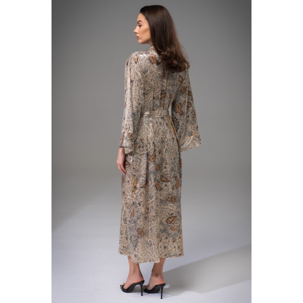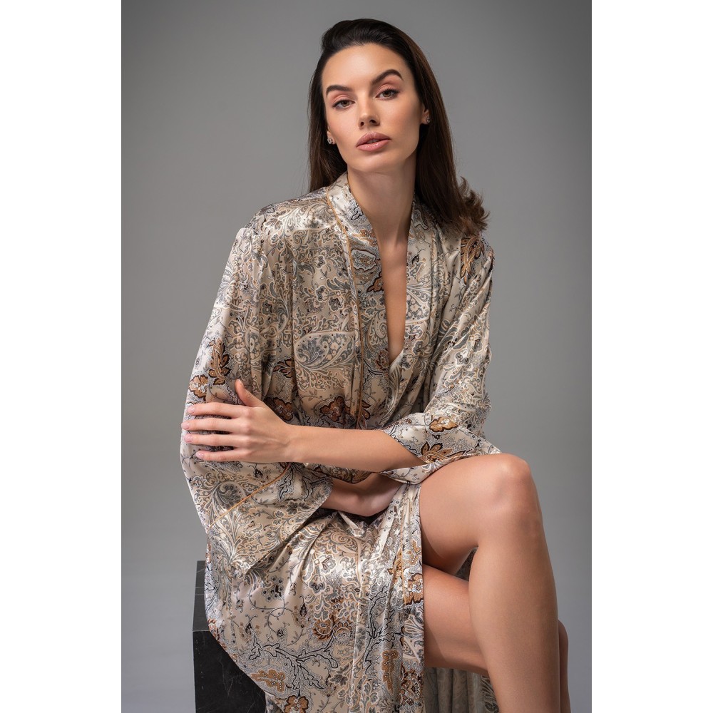 Довгий халат назапах Лівія 4499 від Mia-Amore виконаний із змішаного принтованого полотна. Низрукавів, планка бортів оброблена контрастним кантом. Халат заорюється на пояс,у бічних швах є кишені.Склад 70%натуральний шовк, 25% поліестер, 5% еластан.