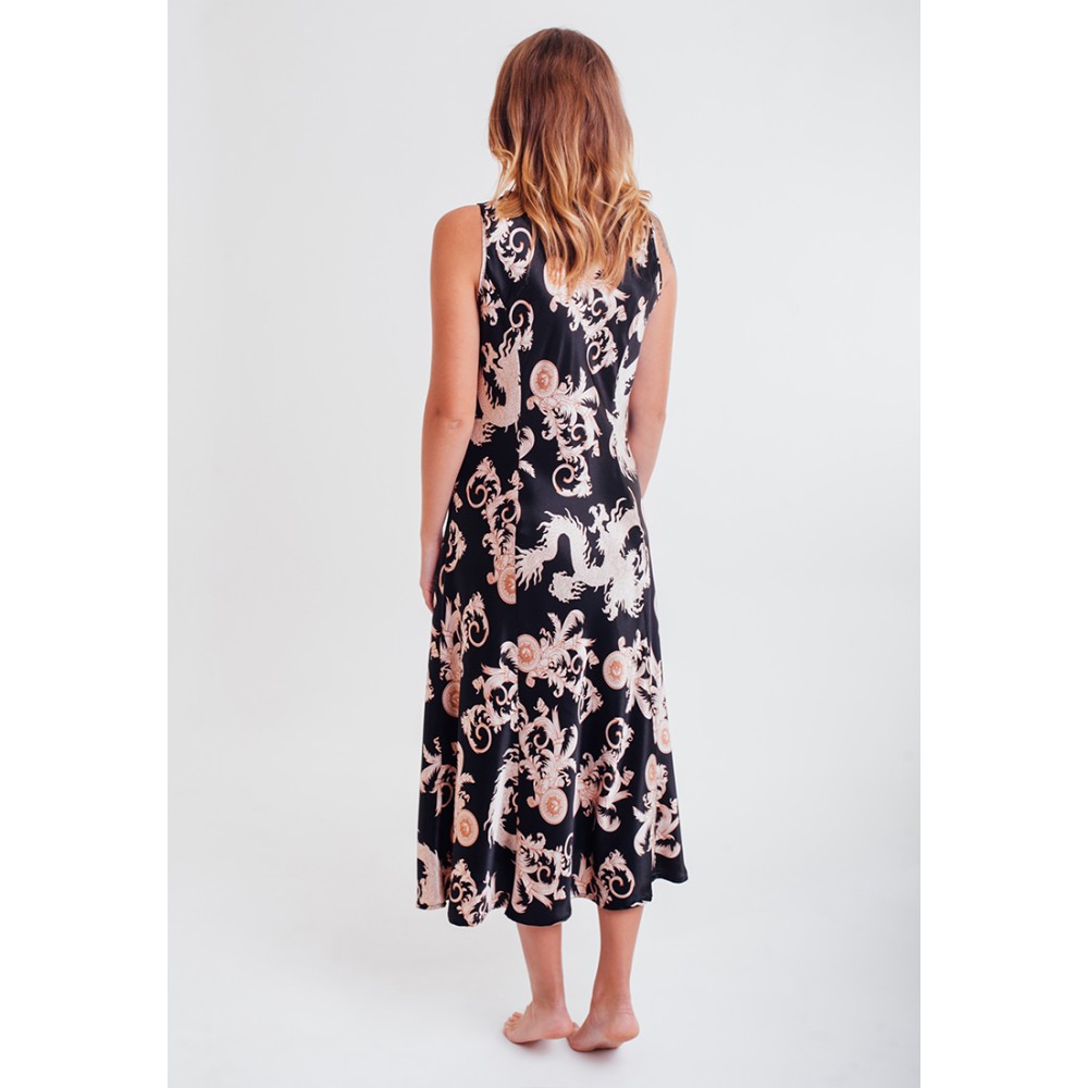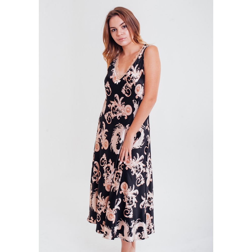 Жіноча нічна сорочка "Версаче Голд" 9935 від Mia-Mella нижче колін з атласної шовку і оригінальним принтом у вигляді драконів. Ліф комбінації прикрашений підвіскою і оригінальним мереживом кремового кольору. Склад: 100% поліестер.
