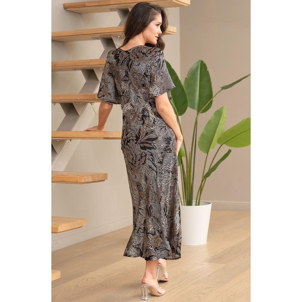 Довга сорочкаСелеста 4048 від Mia-Amore з вертикальними рельєфами та короткимирукавами-реглан, напівприлеглого силуету, спереду по низу розріз, виготовлена​​з натурального полотна, що принтує. V-подібна горловина оформлена контрастним кантом та декоративним бантиком. Склад: 58%натуральний шовк, 42% віскоза.