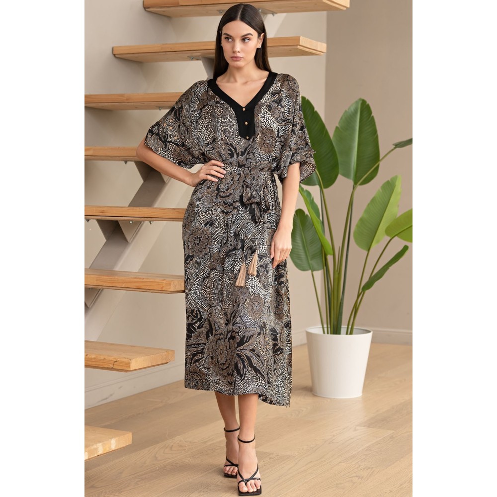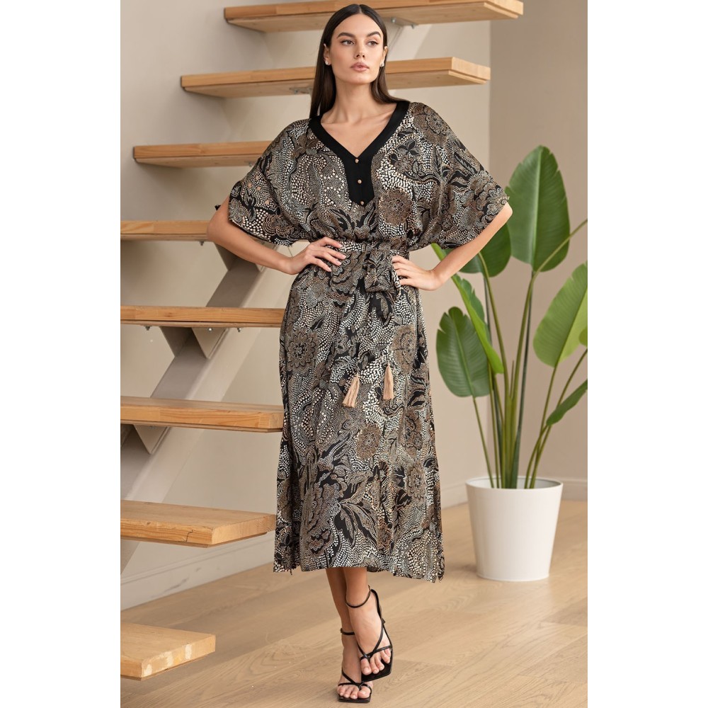 Подовженатуніка Селеста 4041 від Mia-Amore вільного силуету з V-подібноюгорловиною, обробленою контрастною обтачкою з декоративними гудзиками. Тунікавиготовлена ​​з натурального полотна. З боків туніки зручні розрізи, ширину поталії можна регулювати за допомогою знімного пояса із золотими пензликами. Склад: 58% натуральний шовк, 42% віскоза.
