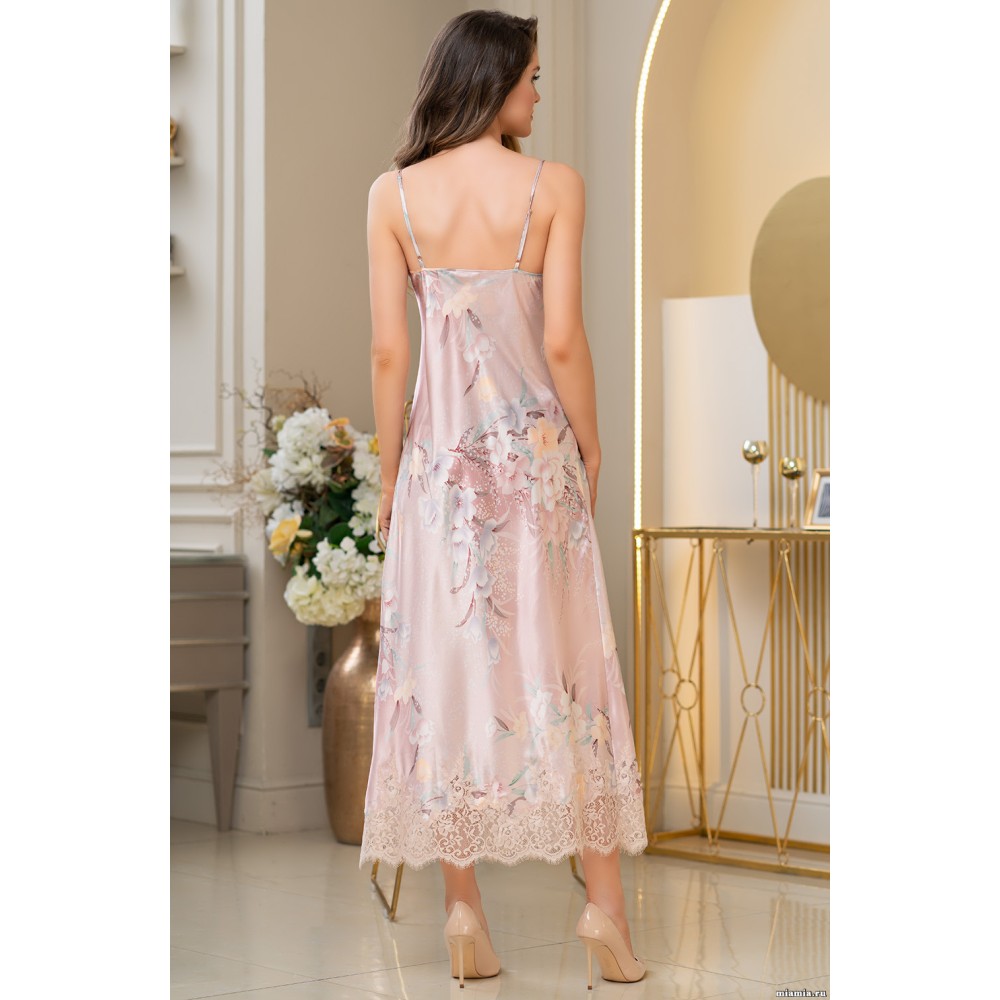 Довга елегантна сорочка Mia-Amore полупрілегающего силуету на тонких бретелях, виконана з принтованого смесового шовку і декорована ажурним мереживом, яке розташоване по вирізу і низу сорочки. З лівого боку оброблений розріз. Декор - атласний бантик з підвіскою по центру вирізу. Склад 70% натуральний шовк, 25% поліестер, 5% еластан