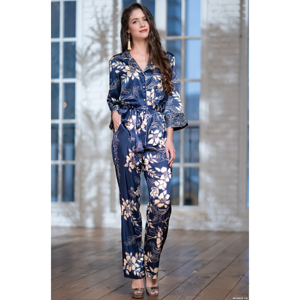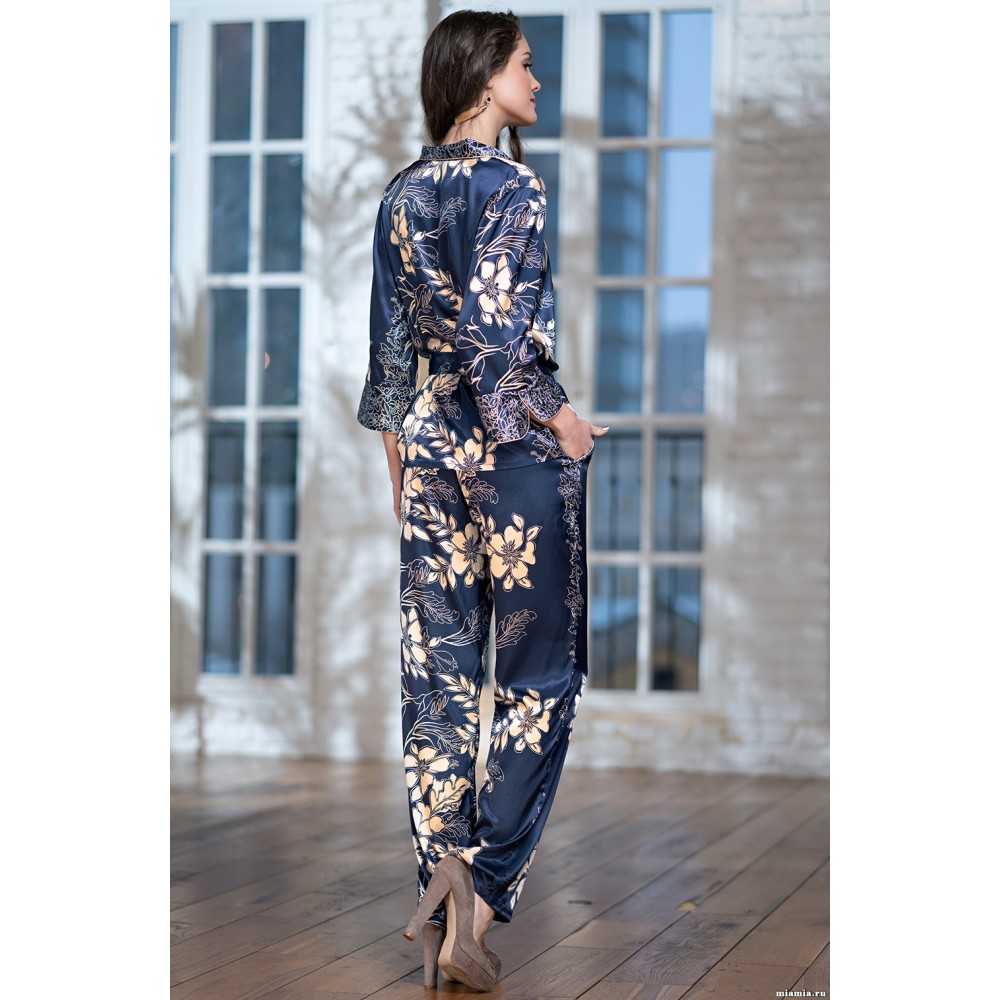 Домашній комплект "Блюмарін" 8446 від Mia-Amore виготовлений з атласної шовку. Комплект складається з жакета на ґудзиках, манжети і комір прикрашені тканиною ніжно-золотистого кольору. Штани з бічними кишенями. У комплекті йде пояс. Склад: 100% поліестер.
