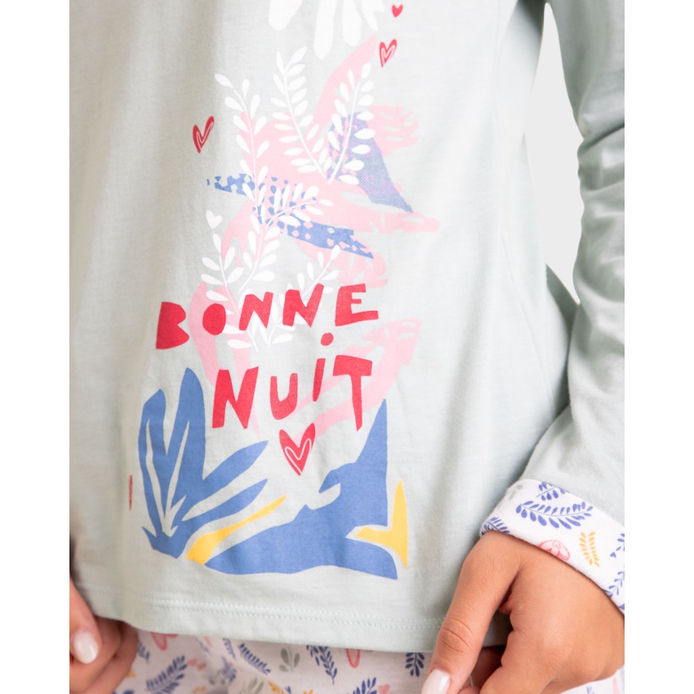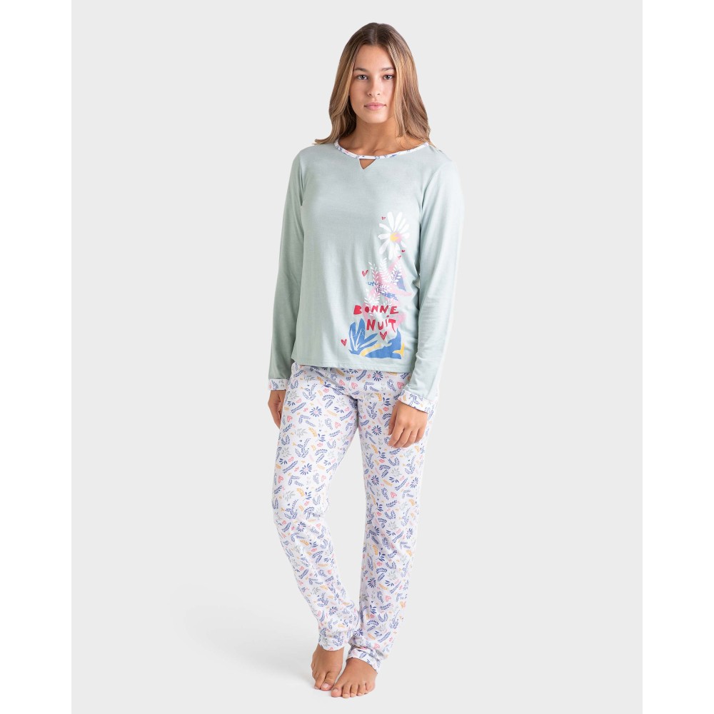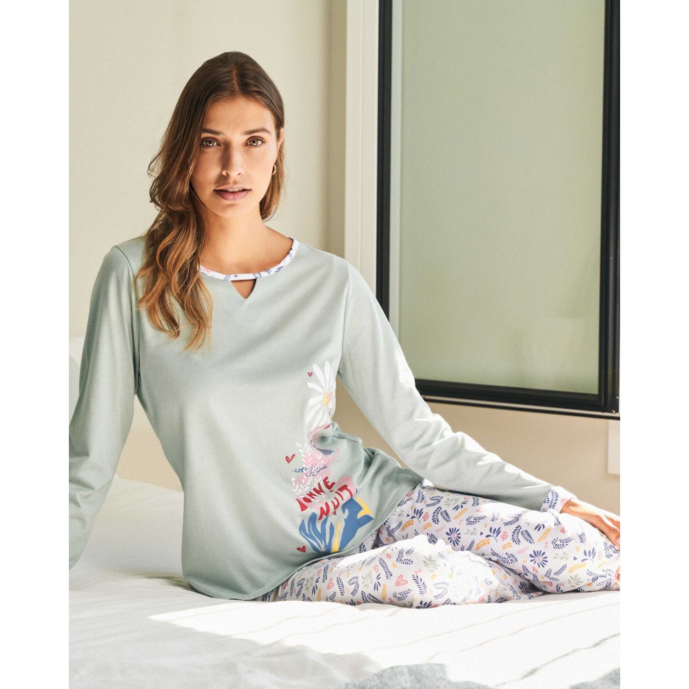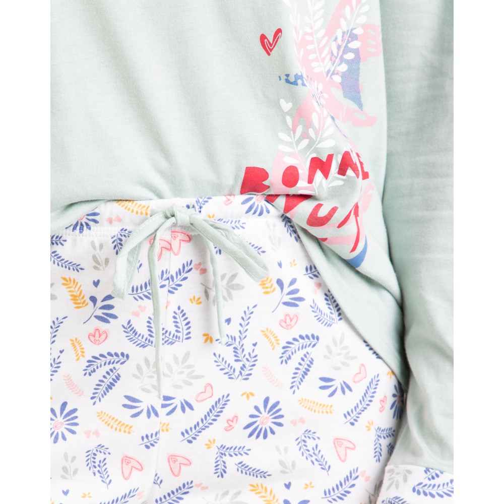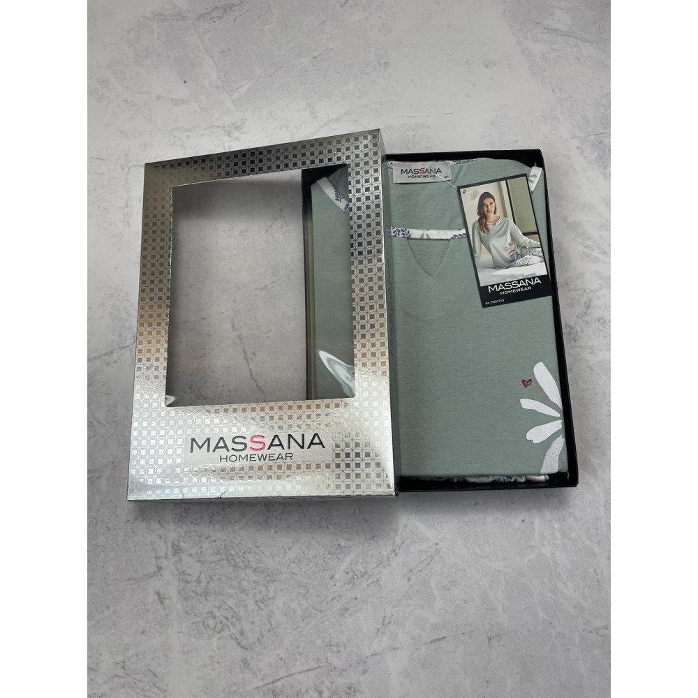 Жіноча піжама Massana P231210 складається із кофти з довгими рукавами, круглим вирізом горловини. Довгіштани з регульованою талією. Склад: 50% бавовна, 50% модал.