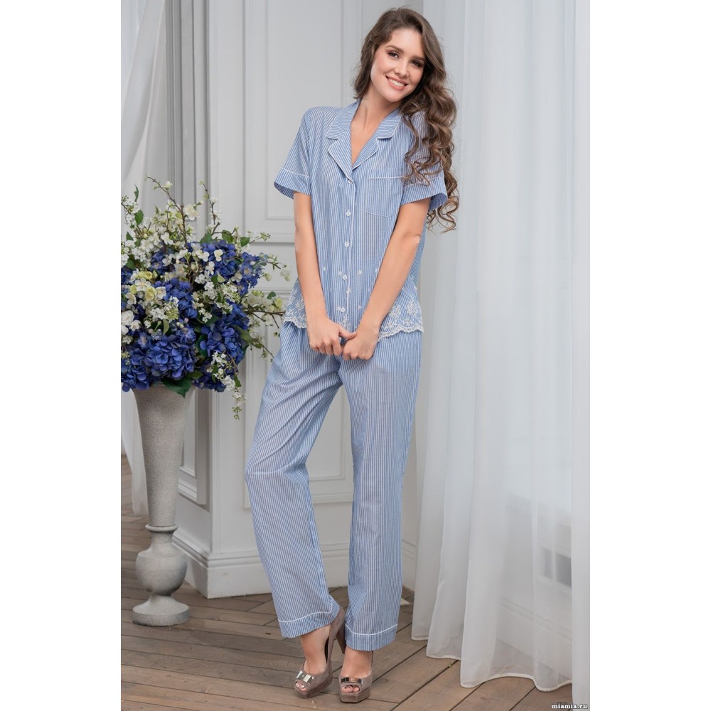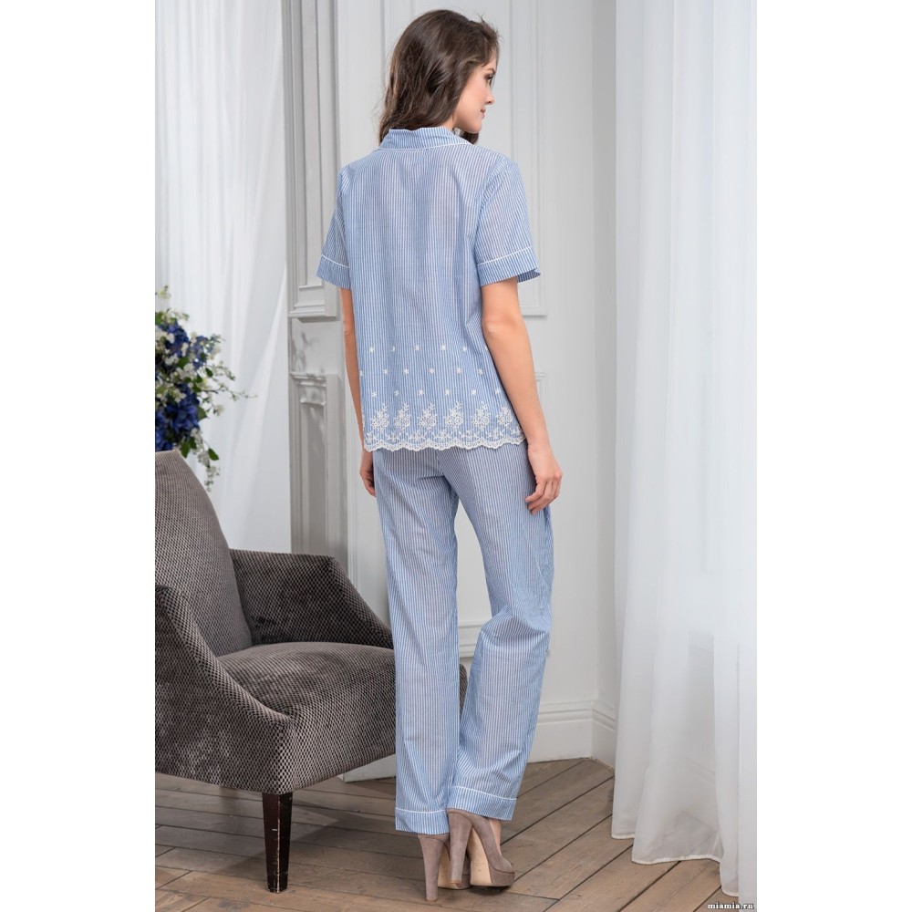 Брючний комплект "Ніцца" 6716 від Mia-Amore з натуральної бавовни в блакитну смужку складається з жакета з короткими рукавами та довгих штанів. Жакет на ґудзиках, з нагрудною накладною кишенею. Низ жакету декорований вишивкою молочного кольору. Штани з кишенями у бокових швах та притачними манжетами. Комір жакету, манжети рукавів та штанів декоровані оздобленням у вигляді білого канта.Склад: 100% бавовна