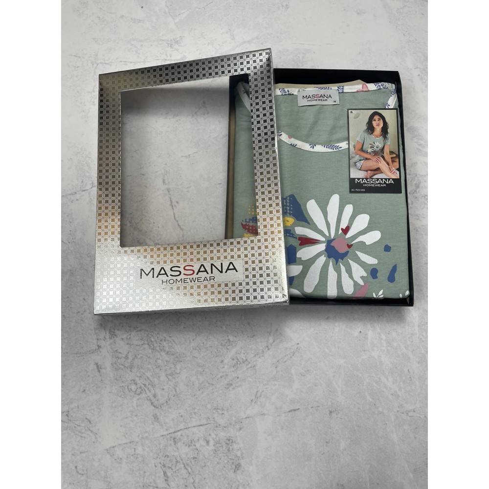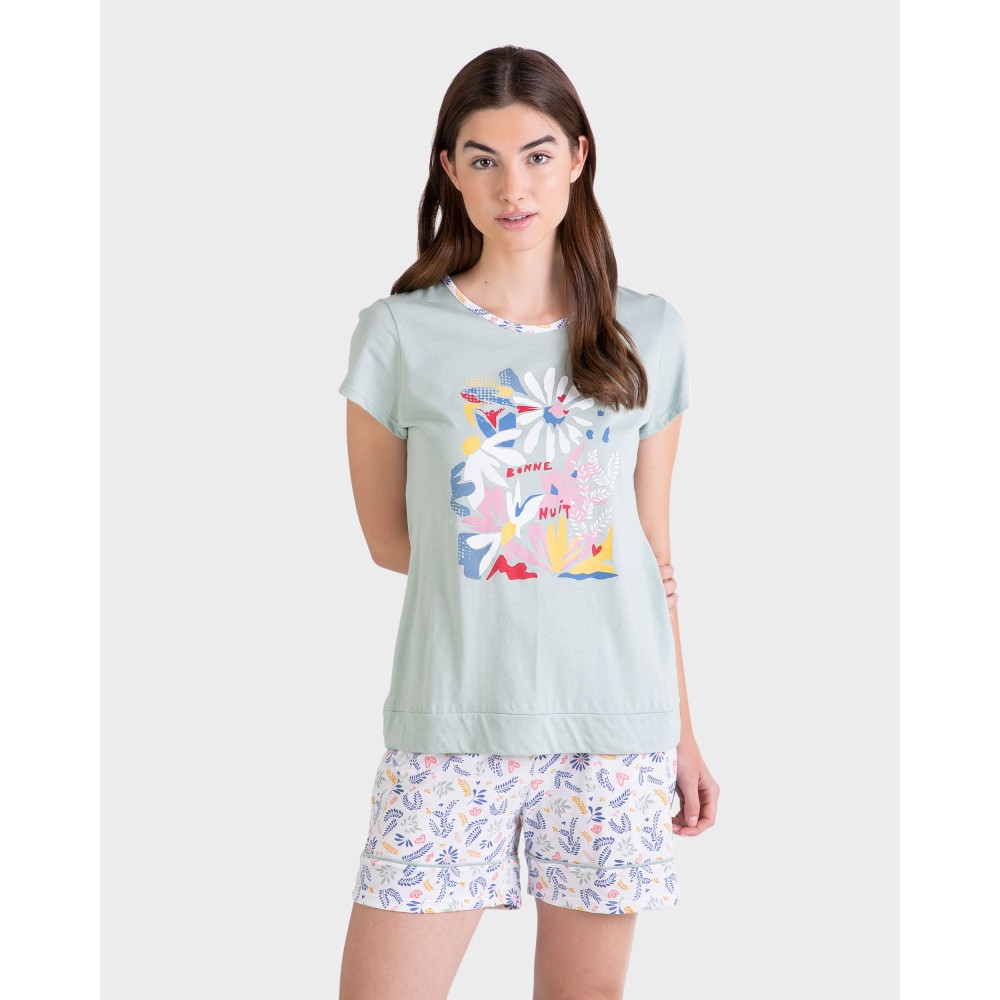 Жіноча піжама Massana P231209, що складається з футболки з короткими рукавами та контрастнимкруглим вирізом. Штани з принтом та регульованою талією. Склад: 50% бавовна, 50% модал.