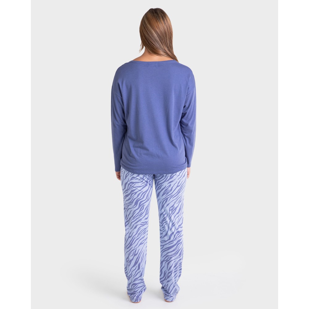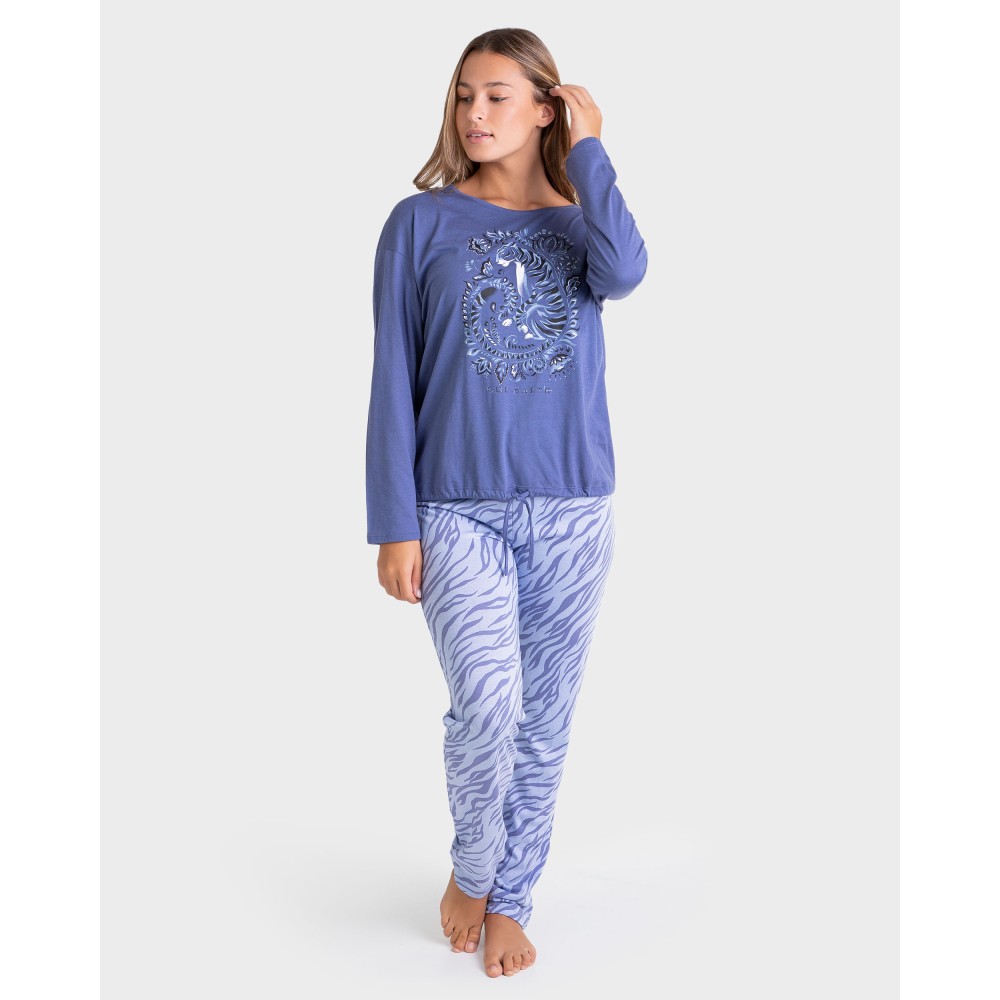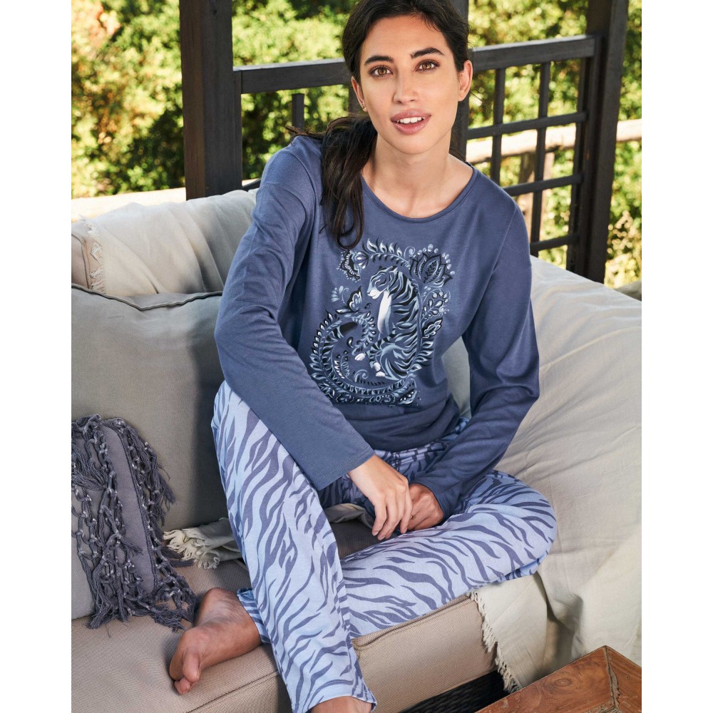 Жіноча піжама збавовняного полотна Massana P231217 складається з кофти з довгим рукавом, по центрурозташований фантазійний малюнок у вигляді тигриці. та штани прямого крою.Склад: 50%бавовна, 50% модал.