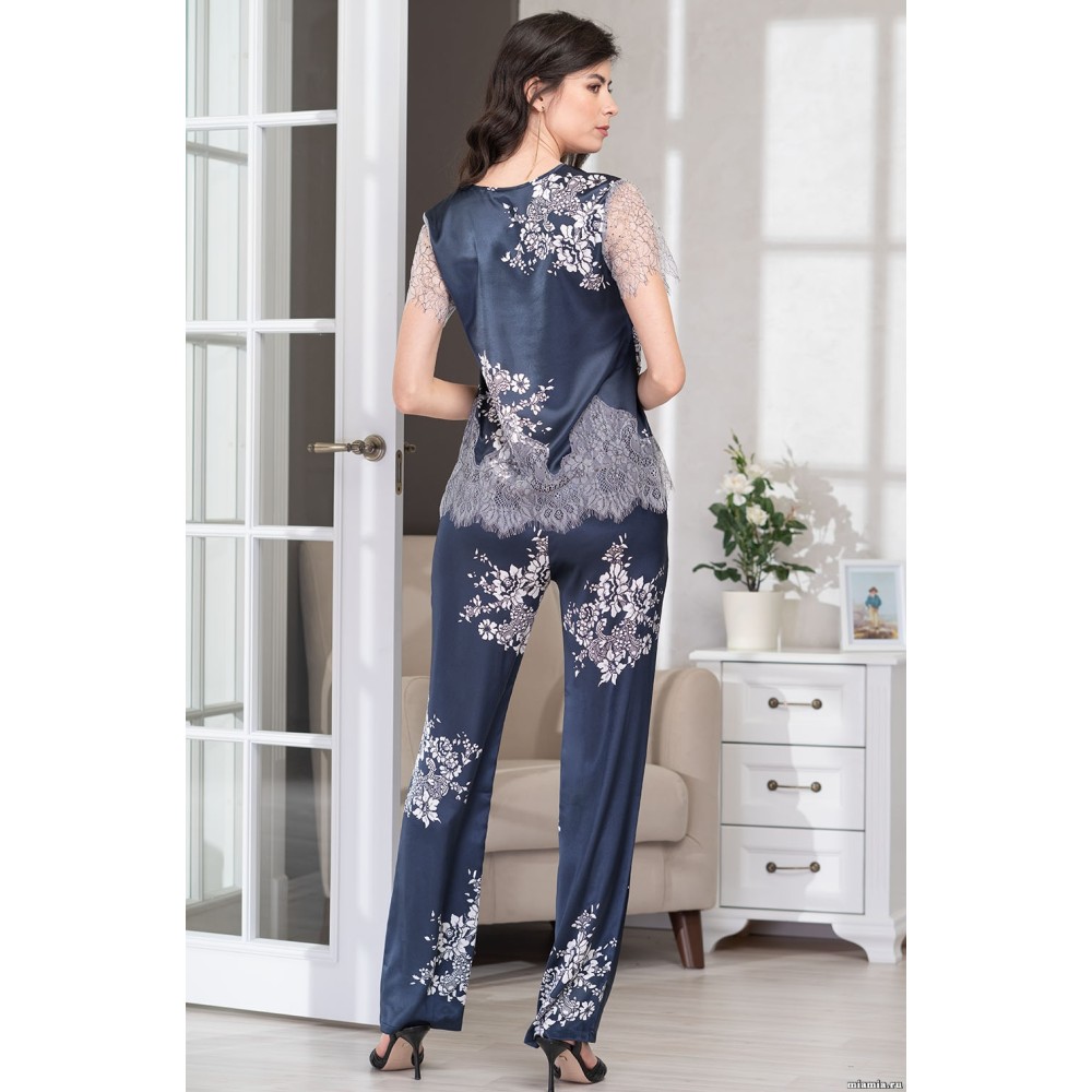 Комплект з брюками "Олександрія" 3576 від Mia-Amore виконаний з принтованого смесового полотна. Низ блузки декорований вишуканим широким мереживом, яке не вирізається, короткі рукава виконані з мережива. По центру ліфа милий бантик з підвіскою. Склад: 70% натуральний шовк, 25% поліестер, 5% еластан.