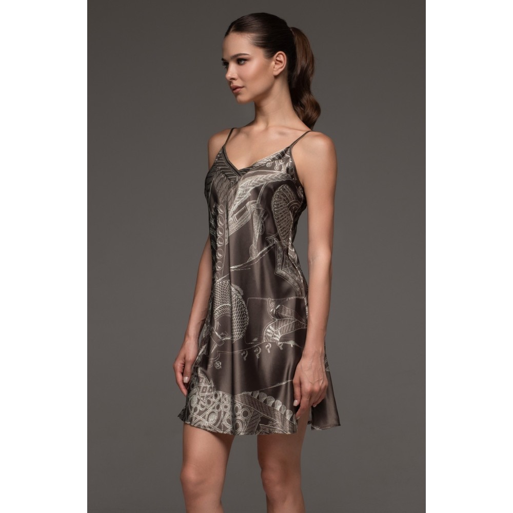 Коротка нічнасорочка Аїша 4311 від Mia-Amore на тонких бретелях, що регулюються, без підрізупід грудьми. Виріб виконаний із принтованого сумішевого шовку. З обох боківрозташовані розрізи для свободи руху. Модель виглядає дуже розкішно таоригінально і може послужити чудовою ідеєю для подарунка вашій близькій такоханій людині.Склад 70%натуральний шовк, 25% поліестер, 5% еластан.