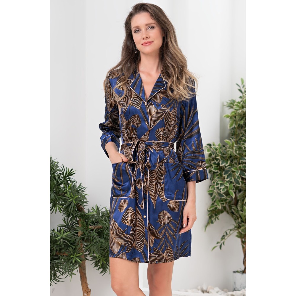 Халат на гудзиках Mia-Amore довжиною до колін з рукавами довжиною ¾, із центральною застібкою на золоті гудзики виконаний із штучного принтованого шовку. Борт, комір, рукави та накладні кишені халата оздоблені золотим кантом. У комплект до халата йде пояс.Склад 100% поліестер.