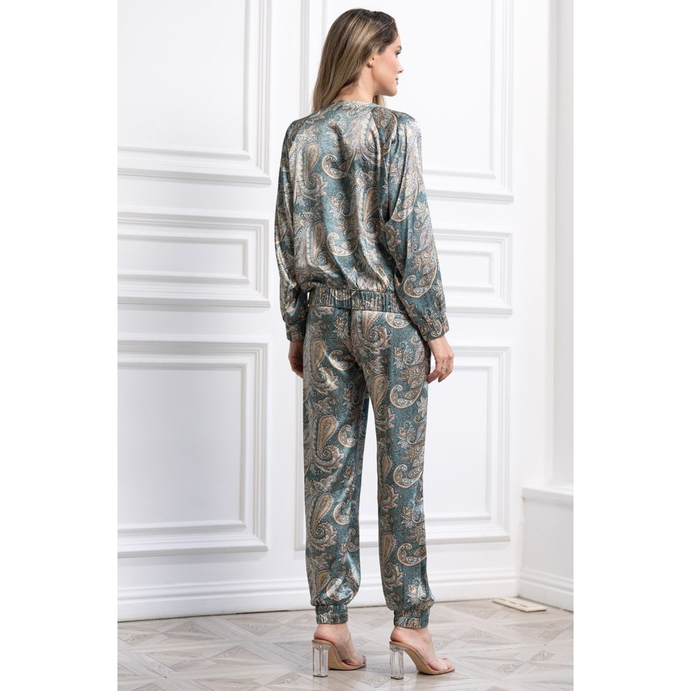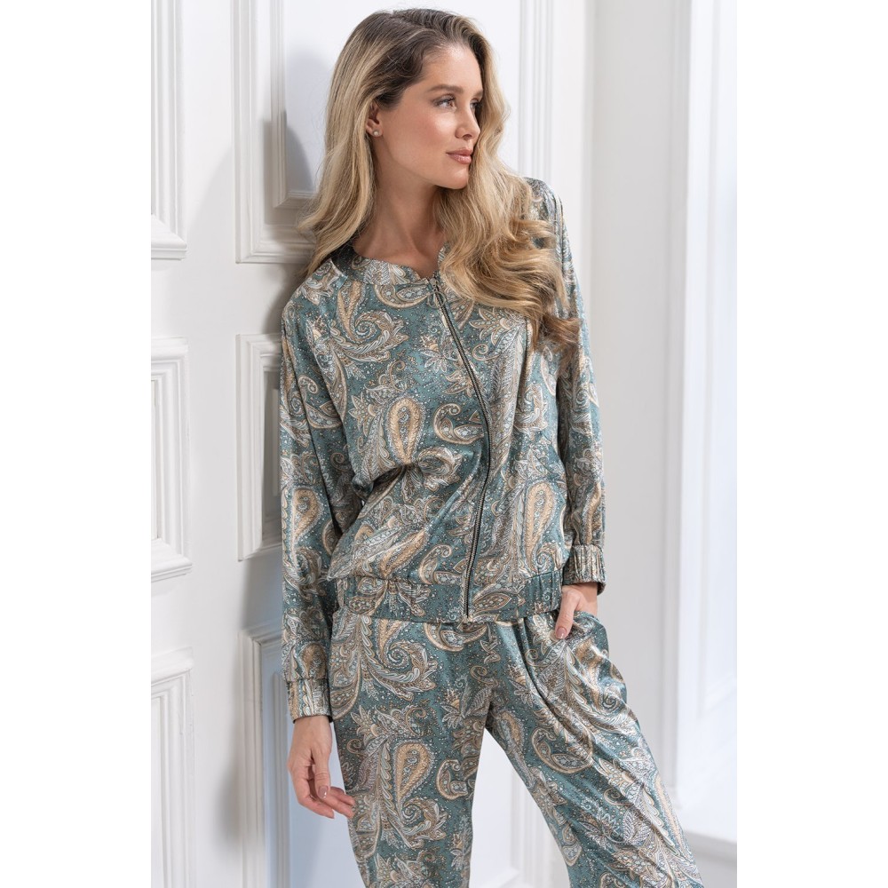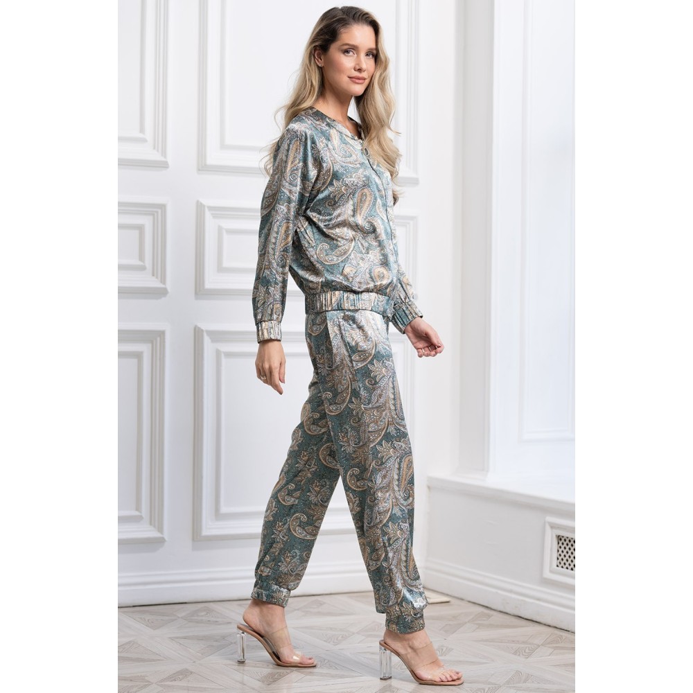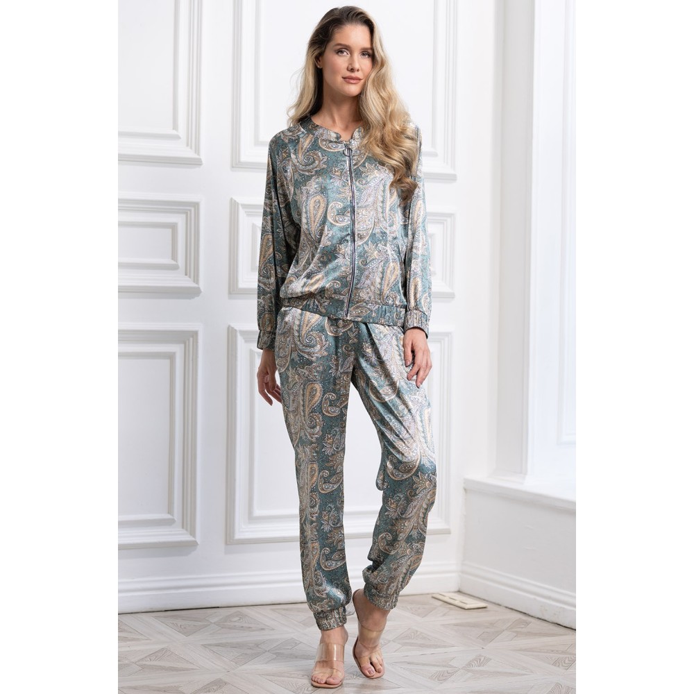 Жіночий домашнійкомплект Донателла 3076 від Mia-Amore складається з бомбера на блискавці таштанів з манжетами на гумці внизу. Бомбер та штани виконані з принтованогосумішевого шовку. З боків штанів оброблені кишені.Склад 70%натуральний шовк, 25% поліестер, 5% еластан.