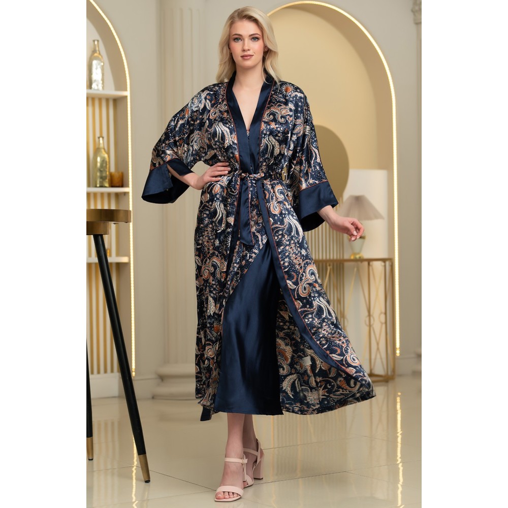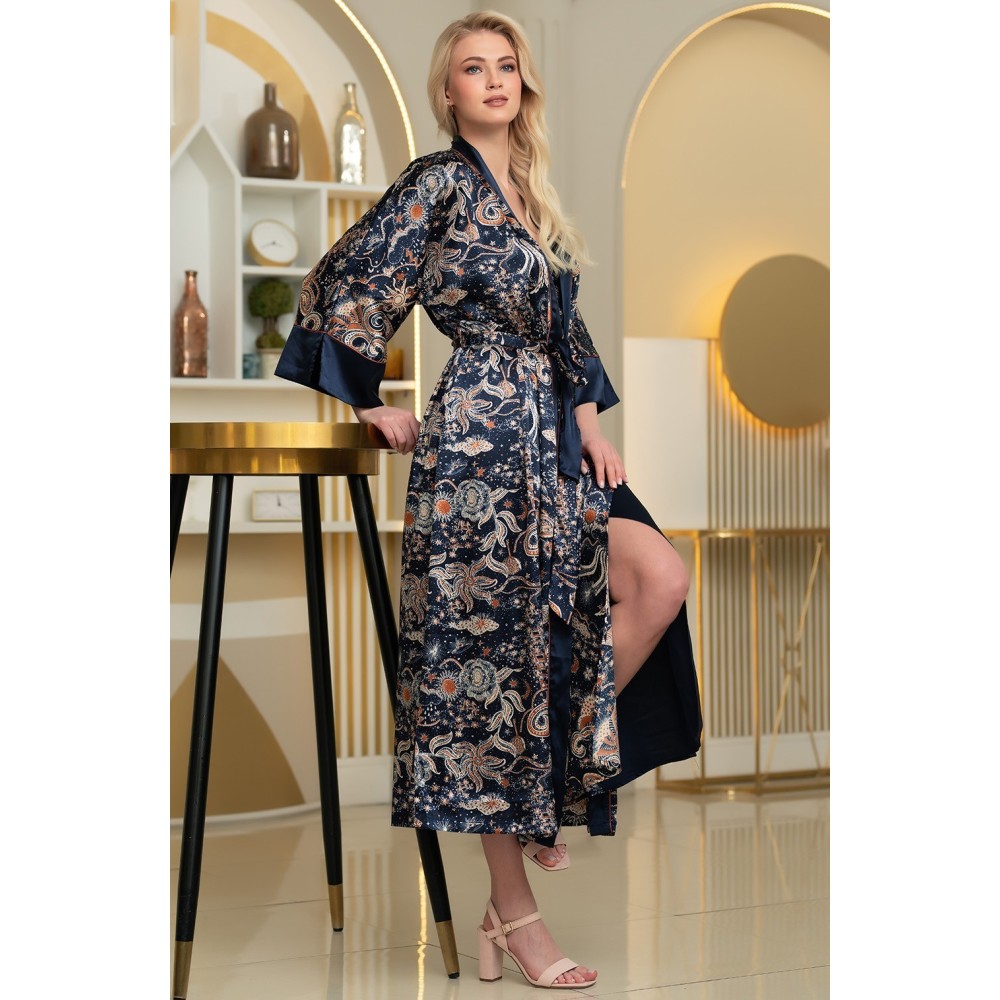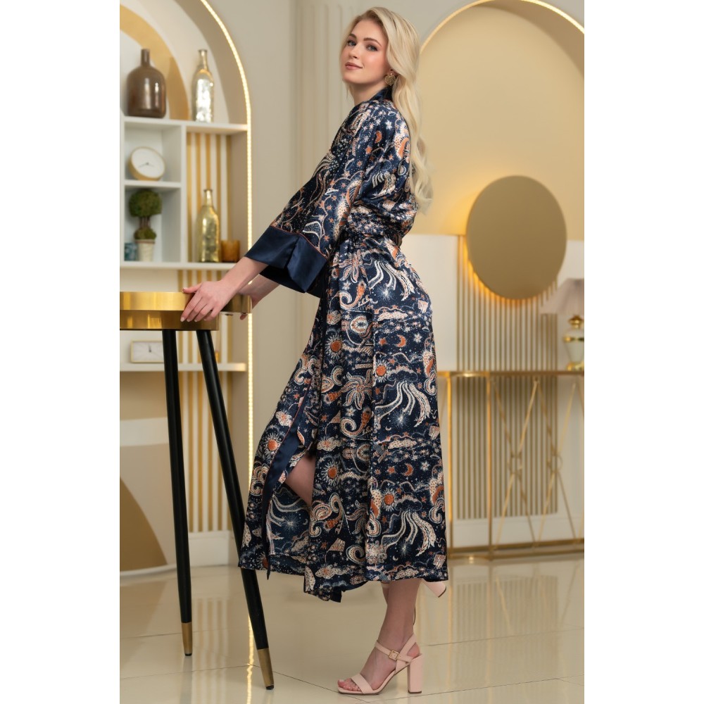 Довгий ароматний халат-кімоно Зодіак 7289 від Mia-Amore здовгими широкими рукавами. Виріб виконаний із принтованого атласу з однотонноюобробкою по бортах і низу рукавів, контрастний кант виступає межею між двомавидами матеріалів. У бічних швах оброблено кишені. Виріб доповнений двоколірнимпоясом із кантом.Склад 100% поліестер.