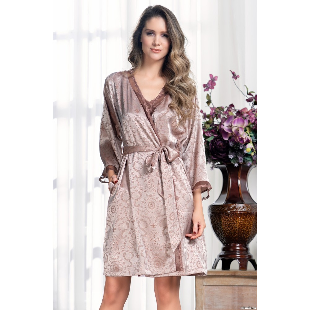 Класичний короткий заорювальної халат "Маргарет" 8973 Mia-Amore з рукавом довжиною ¾, виконаний з штучного шовку з жакардовим малюнком. Тонке напівпрозоре мереживо розташоване по бортах халата і низу рукавів. У бічних швах оброблені кишені. Склад 100% поліестер