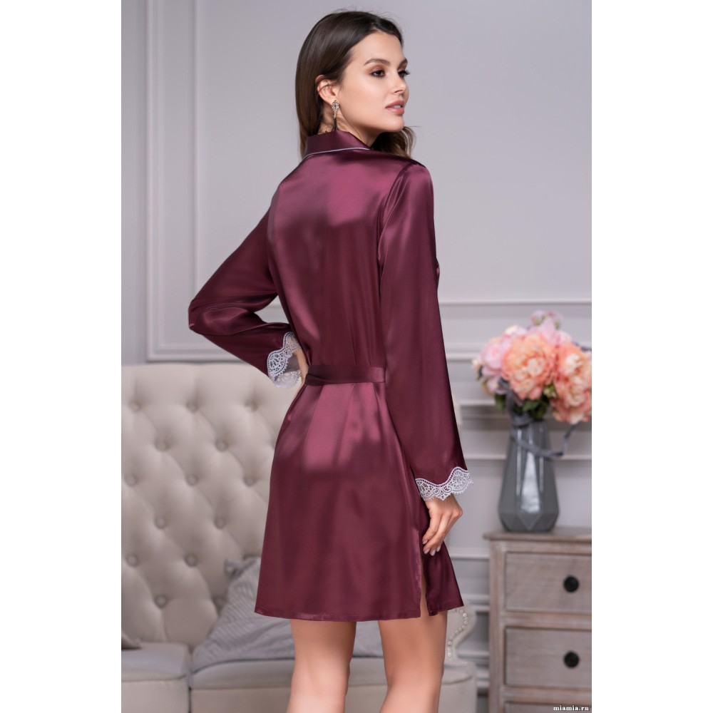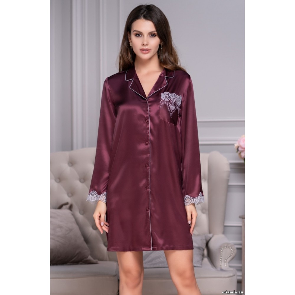 Халат-сорочка "Лаура" 3297 від Mia-Amore з довгим рукавом, виконаний з однотонного смесового шовку. Оздоблення у вигляді контрастного канта по краях борту. Низ рукавів оброблений вузьким мереживом в колір вишивки. Верх накладного кишені прикрашений вишивкою. По низу розташовані невеликі розрізи. Виріб доповнено поясом з декоративними китицями на кінцях. Склад: 70% натуральний шовк, 25% поліестер, 5% еластан