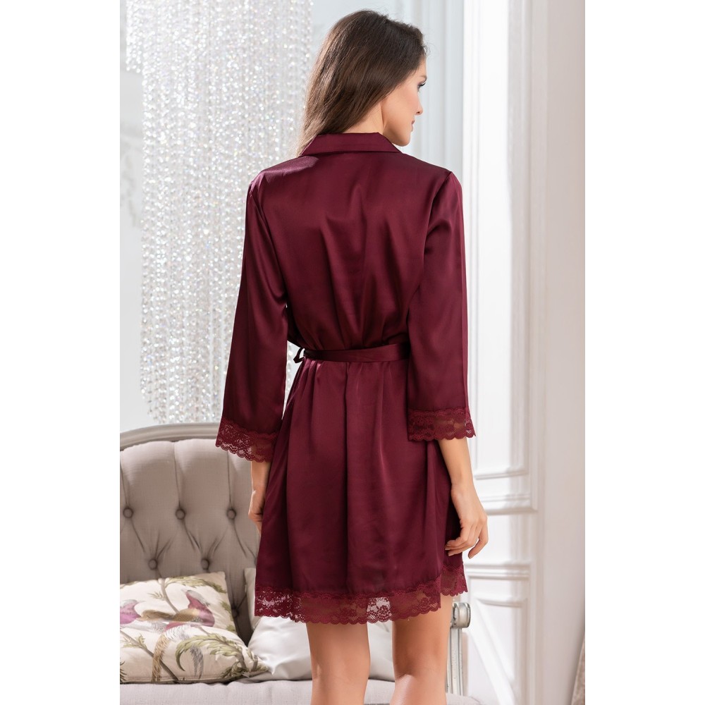 Короткий халат Mia-Amore на гудзиках з рукавом довжиною 3/4, виконаний із однотонного штучного шовку із блиском. Мереживні вставки прикрашають низ рукавів, низ виробу та кінці пояса. У бічних швах оброблено кишені.Склад 100% поліестер.