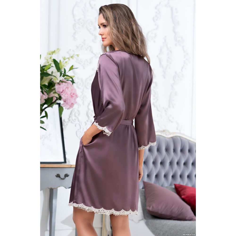 Короткий халат Бріджит 3683 від Mia-Amore із запахом і з рукавами довжиною ¾ виконаний з однотонного шовку. По низу рукавів, плечей і краях полички халат прикрашений різьбленим витонченим мереживом кольору екрю. У бічних швах кишеньки.Склад 70% натуральний шовк, 25% поліестер, 5% еластан