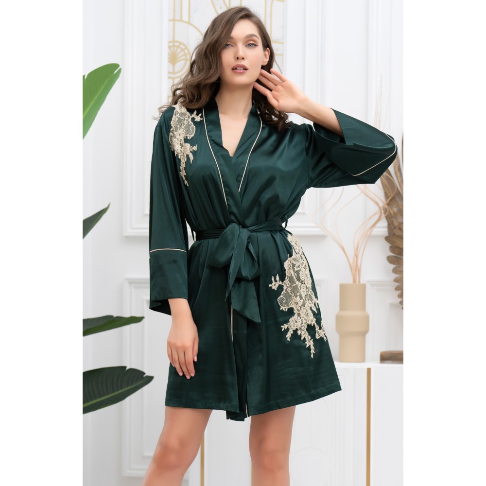 Короткий халат назапаз Фелліні 3913 від Mia-Amore з довгими рукавами виконаний із шовку. Спередуверхня частина та протилежна підлоги халата прикрашені мереживними вставками.Планка та широкі манжети халату декоровані контрастними кантами.Склад: 70%натуральний шовк, 25% поліестер, 5% еластан.