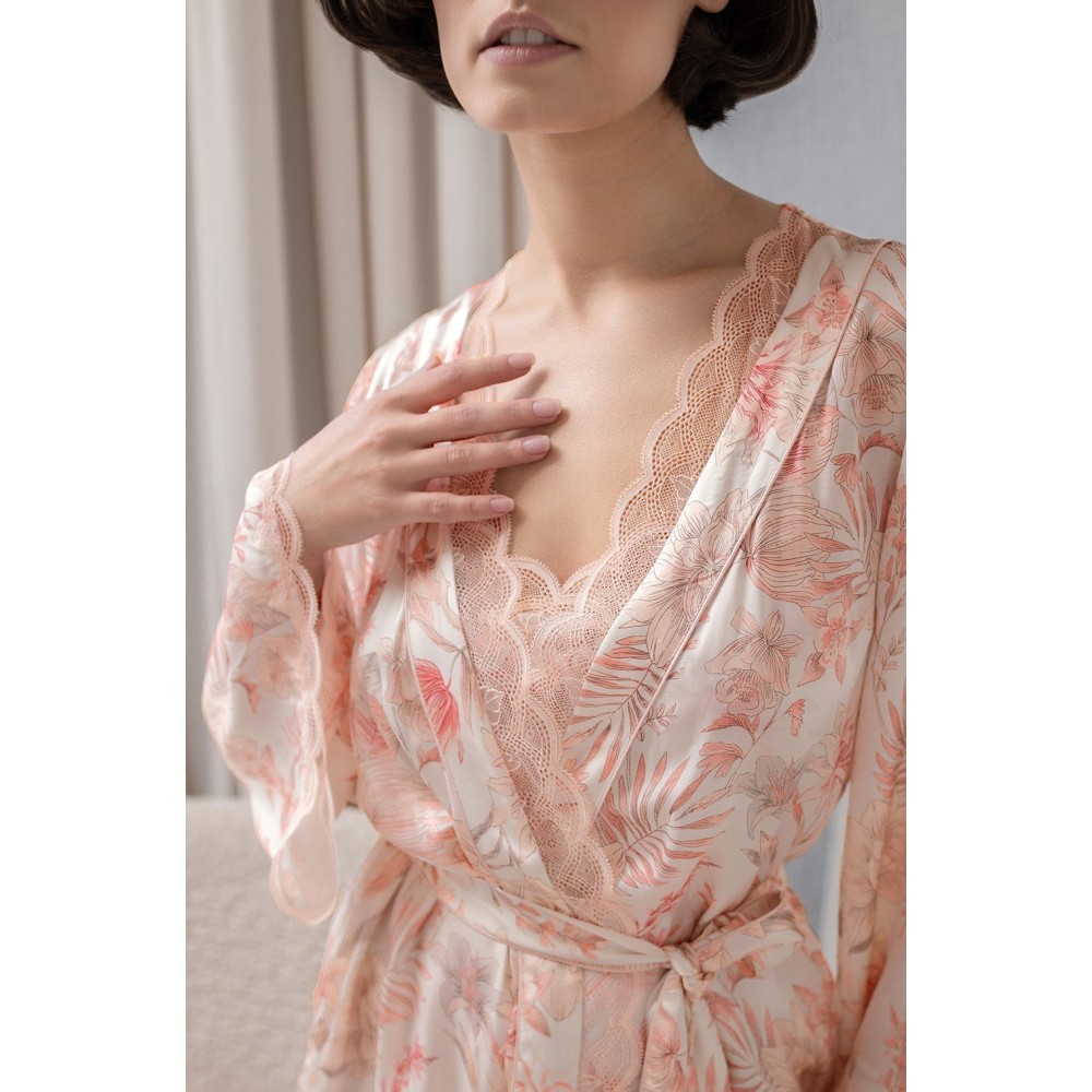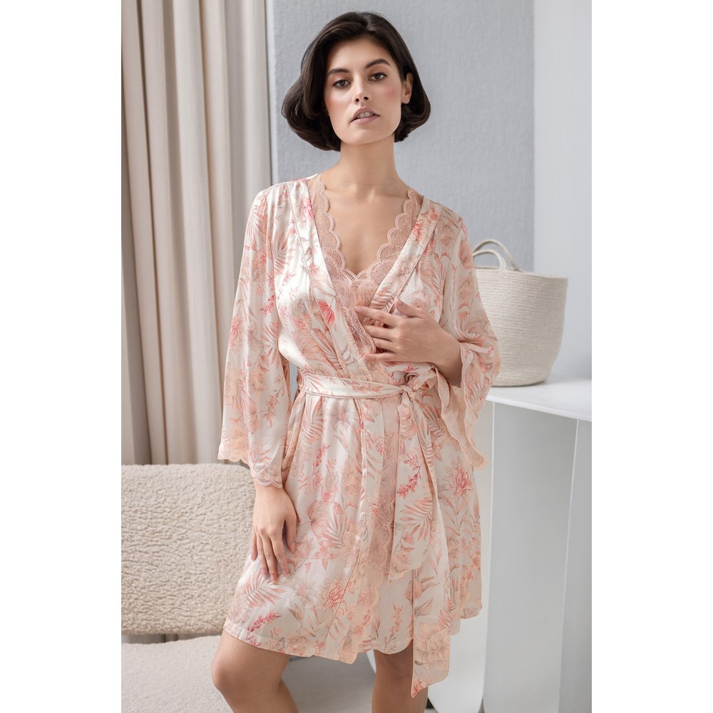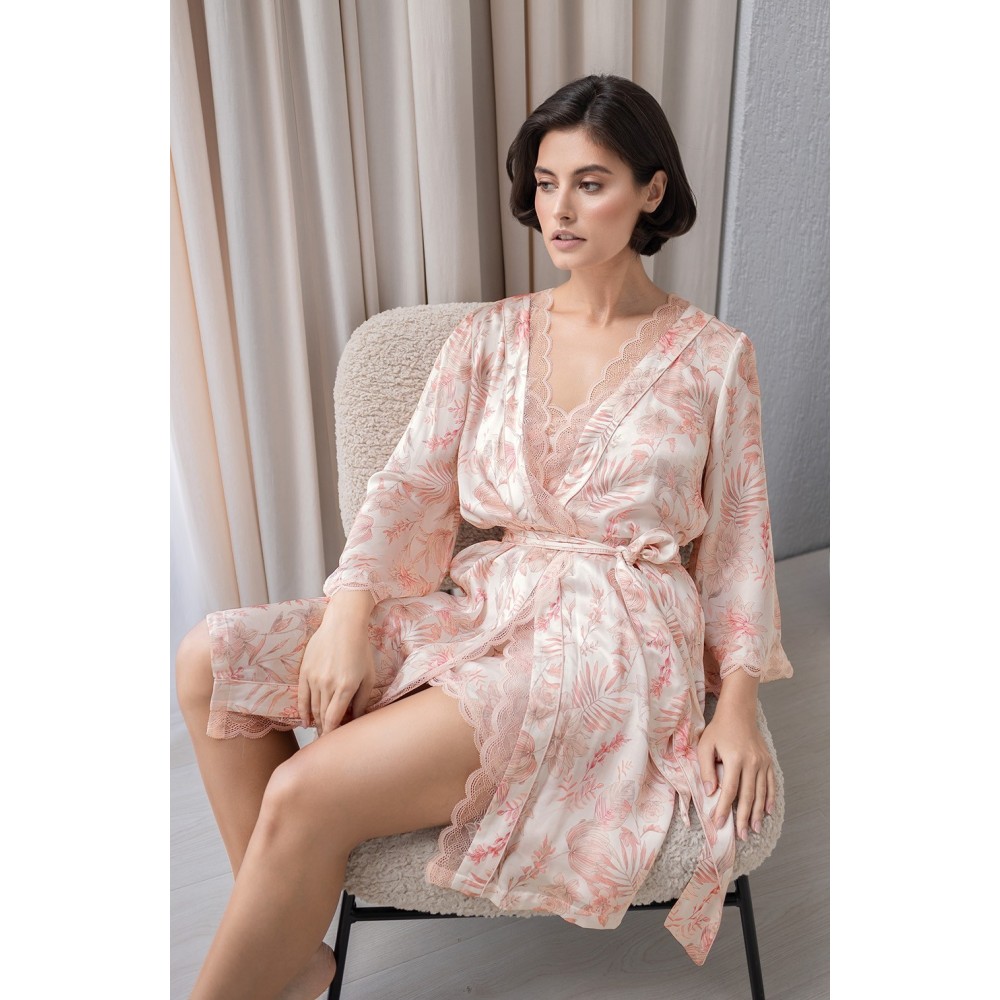 Короткий халат-кімоно на запах Моллі 1923 відMia-Amore з широким рукавом довжиною 3/4. Виріб виконаний із принтованогосумішевого шовку. Ажурне мереживо прикрашає борти та низ рукавів. З обох боківоброблені кишені.Склад: 58% натуральний шовк, 42% віскоза.