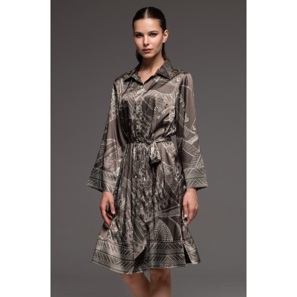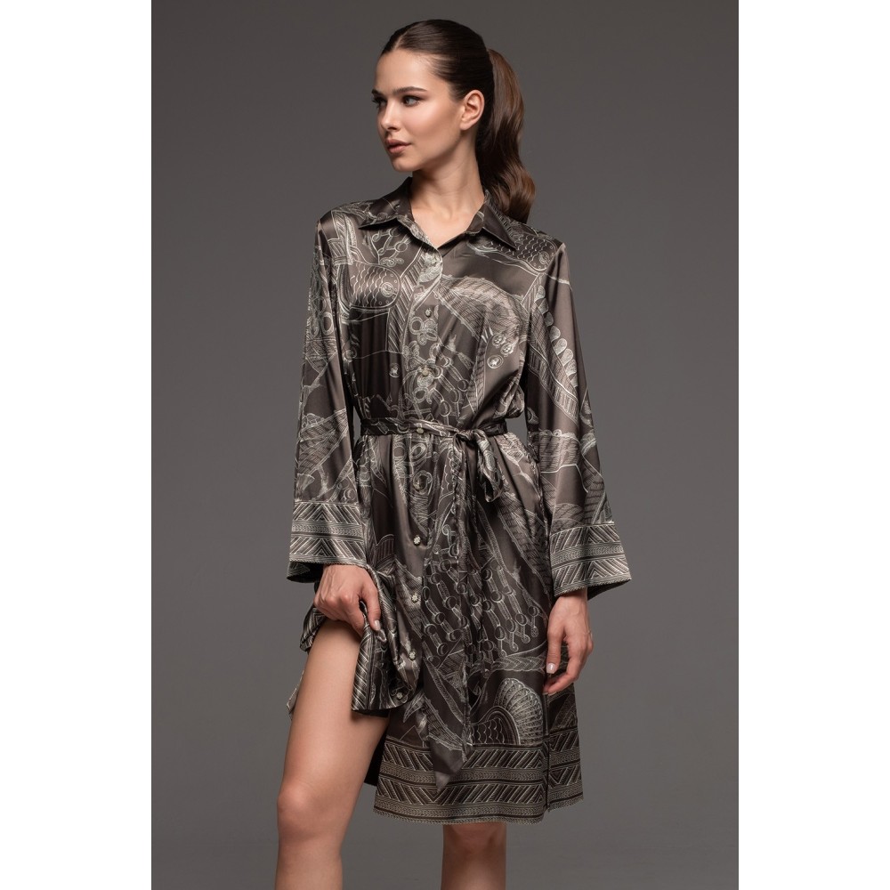 Жіночий шовковийхалат на гудзиках Аїша 4327 від Mia-Amore вільного силуету з довгим рукавом.Виріб виконаний із принтованого сумішевого шовку. У бічних швах обробленокишені. З обох боків розташовані розрізи для свободи руху. Лінію талії можнапідкреслити за рахунок широкого поясу, що йде у комплекті.Склад 70%натуральний шовк, 25% поліестер, 5% еластан.