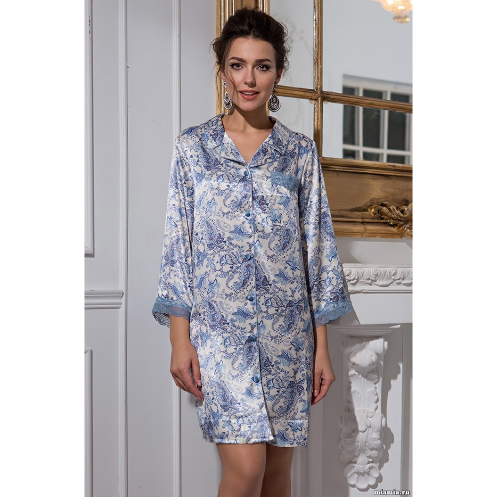 Шовковий жіночий халат на ґудзиках "Дольче Віта" 5917 від Mia-Amore. Краї рукавів прикрашені мереживом в колір тканини. Халат можна укомплектувати з сорочкою 5910 і 5914. Склад: 70% натуральний шовк, 25% поліестер, 5% еластан.