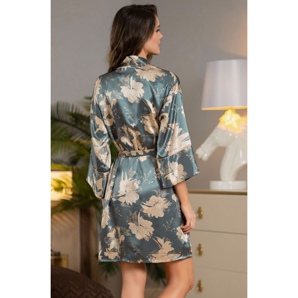 Короткий жіночийхалат на запах Орнелія 3833 від Mia-Amore з рукавами завдовжки ¾ виконаний ізпринтованого шовку. Горловина та низ рукавів декоровані кремовим кантом.Комплектується поясом, у бічних швах кишеньки.Склад: 70%натуральний шовк, 25% поліестер, 5% еластан.
