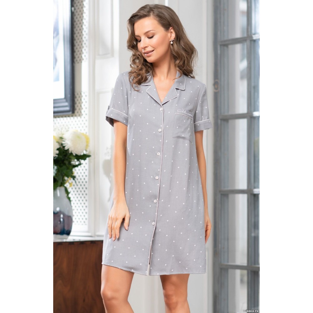Халат Mia-Mella з коротким рукавом, вільного силуету. Виконана з тканої принтованої віскози з обробкою у вигляді контрастних кантів. На верхній лівій частині полички розташована накладна кишеня. У бічних швах оброблені кишені, а по низу розрізи. Лінію талії можна підкреслити за рахунок пояса.Склад 75% віскоза, 25% поліестер.