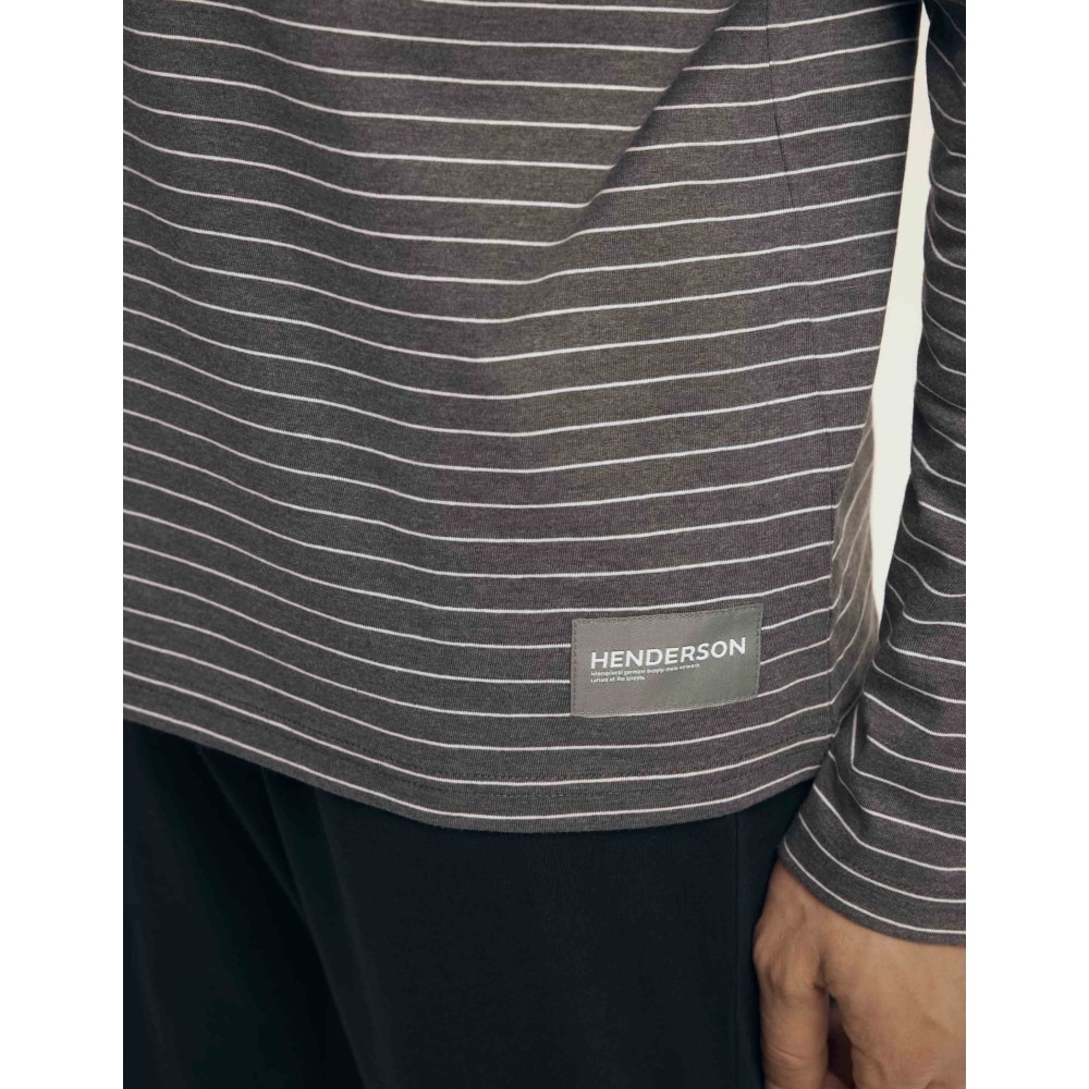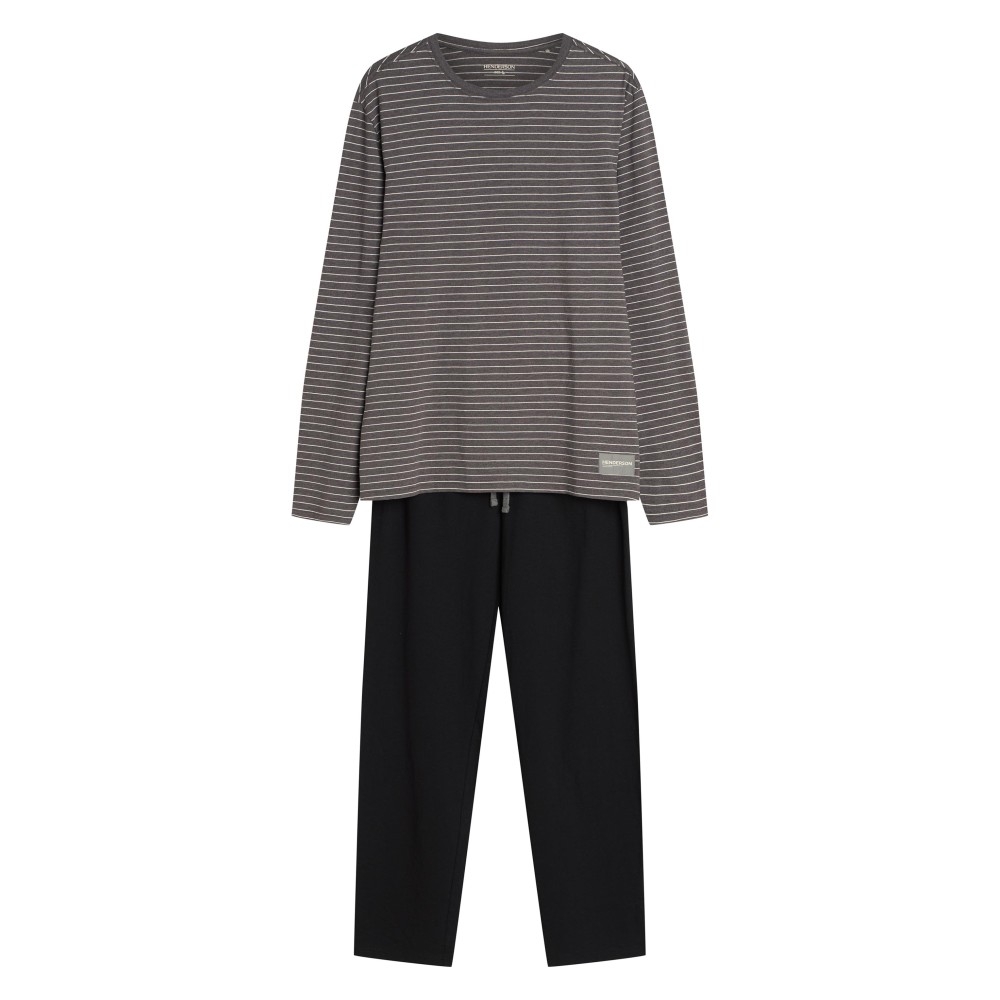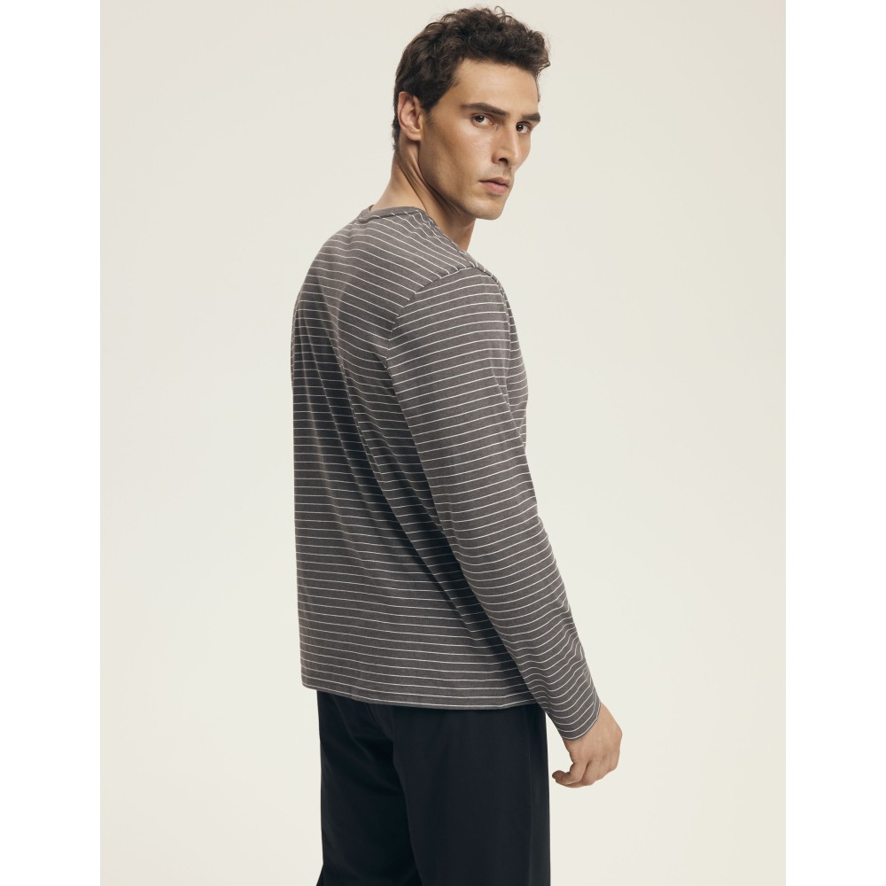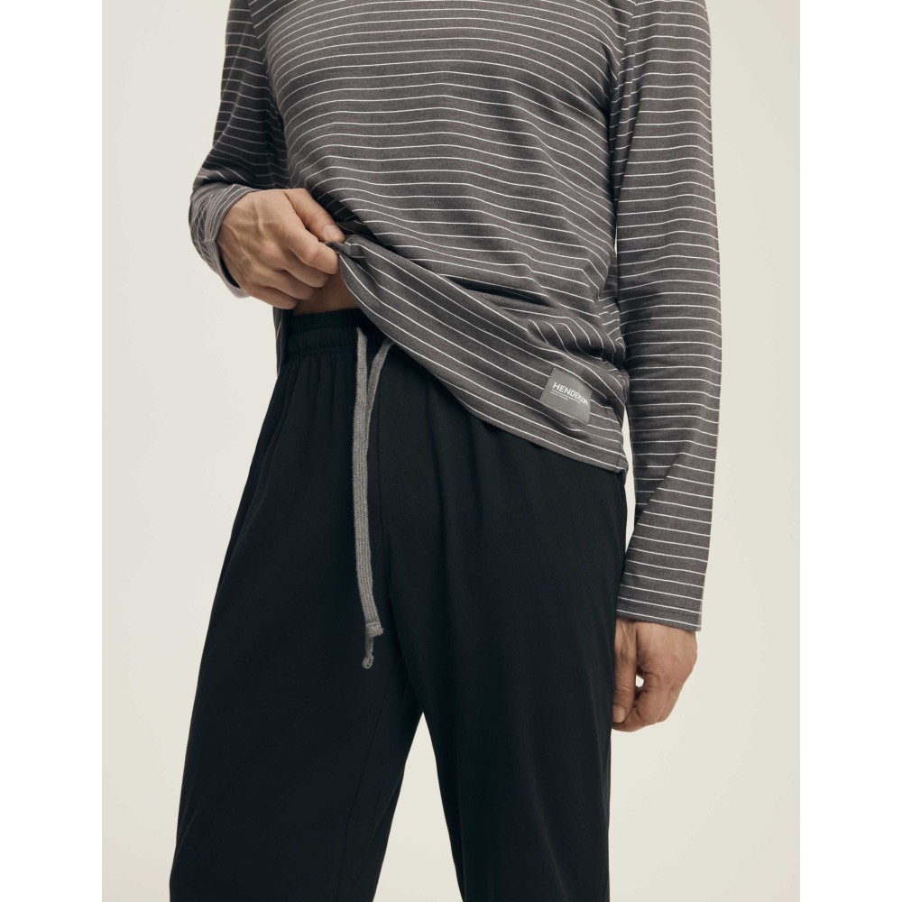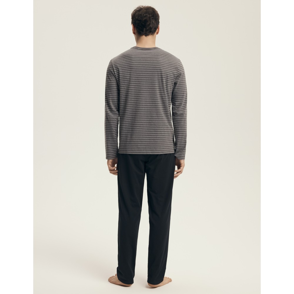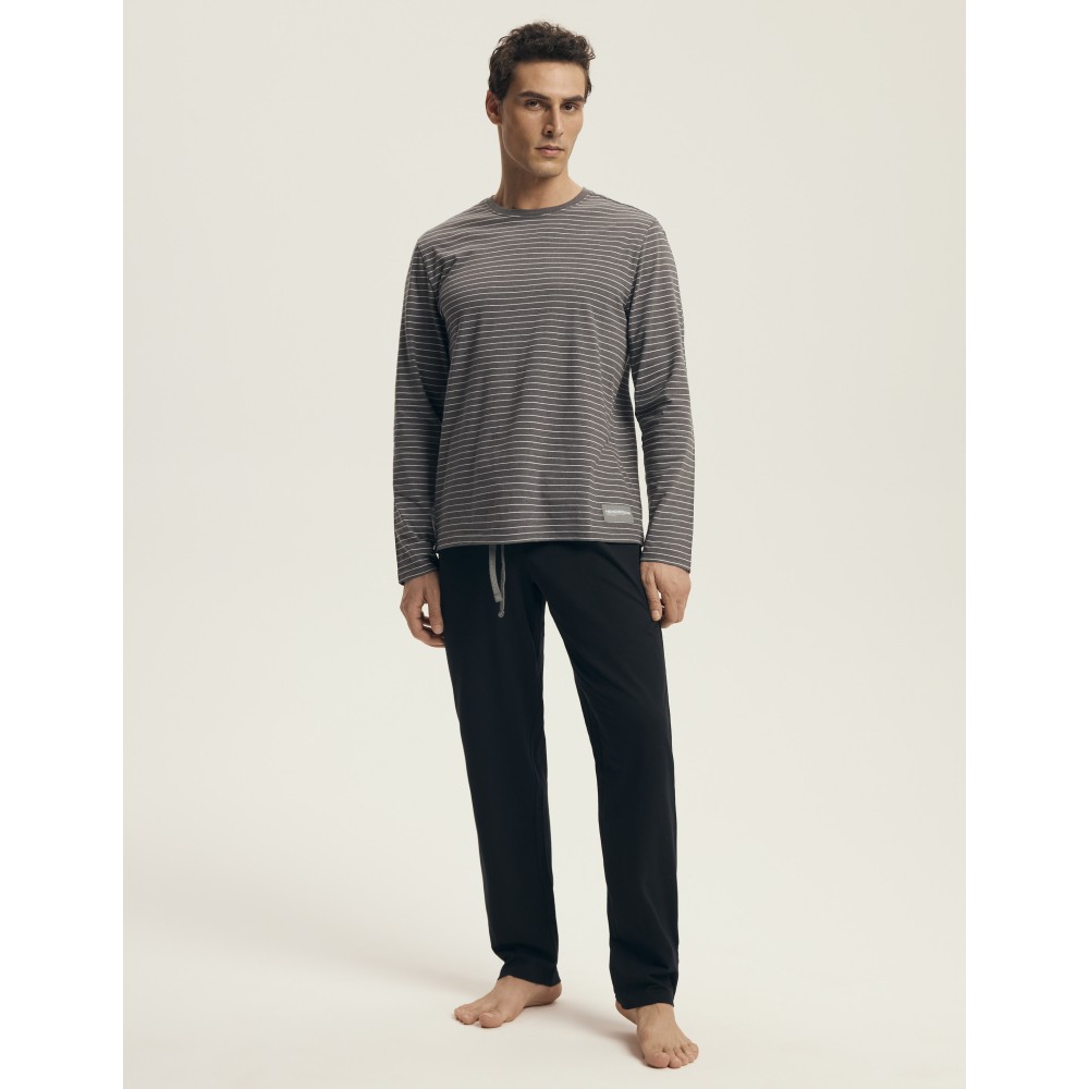 Стильная мужская пижама из натурального хлопка. Серая полосатая блуза с длинным рукавом в сочетании с классическими чёрными штанами на завязке создают идеальный дуэт для комфортного сна и домашнего уюта.