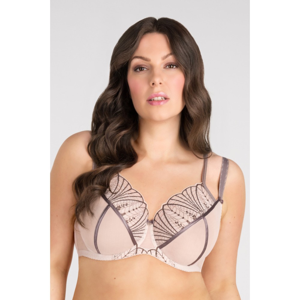 Мягкий бюстгальтер, рассчитанный на женщин со средней, большой и очень большой грудью. Обеспечивает эффект очень сильного подъема и сбора груди к центру. Чашечки из 3 частей из прочного тюля. Дополнительная бретелька и слой эластичного кружева на верхней чашке облегчают силуэт и прекрасно маскируют асимметрию груди. Швы на чашках покрыты атласной тесьмой контрастного цвета. Спинка из прозрачной лайкры, обеспечивающей очень хорошую посадку и поддержку. Боковые косточки предотвращают скатывание материала. В зависимости от размера два или три ряда крючков с трехступенчатой регулировкой окружности. Несъемные, регулируемые бретели трех ширин. Металлические элементы цвета мокко.