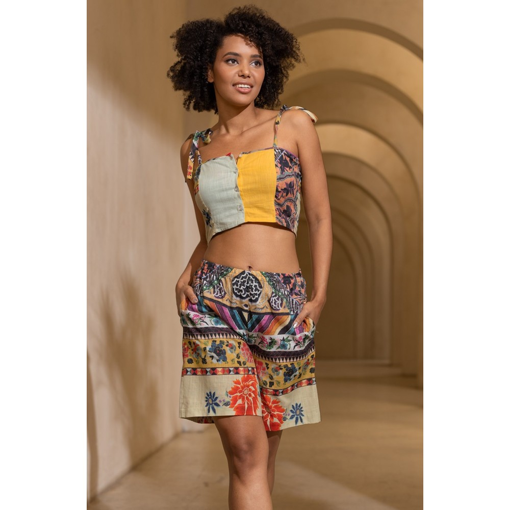 Комплект Камбоджа5272 від Mia-Amore складається з кроп-топу на бретелях і із застібкою по центрута подовжених шортів. Полиця і спинка топа виконана з двох видів однотонного компаньйона,з боків топа розташовані вставки тканини, що принтує. Шорти виготовлені зпринтованої тканини. Шорти із широким еластичним поясом. З боків шортіврозташовані кишені.Склад 60%бавовна, 40% льон