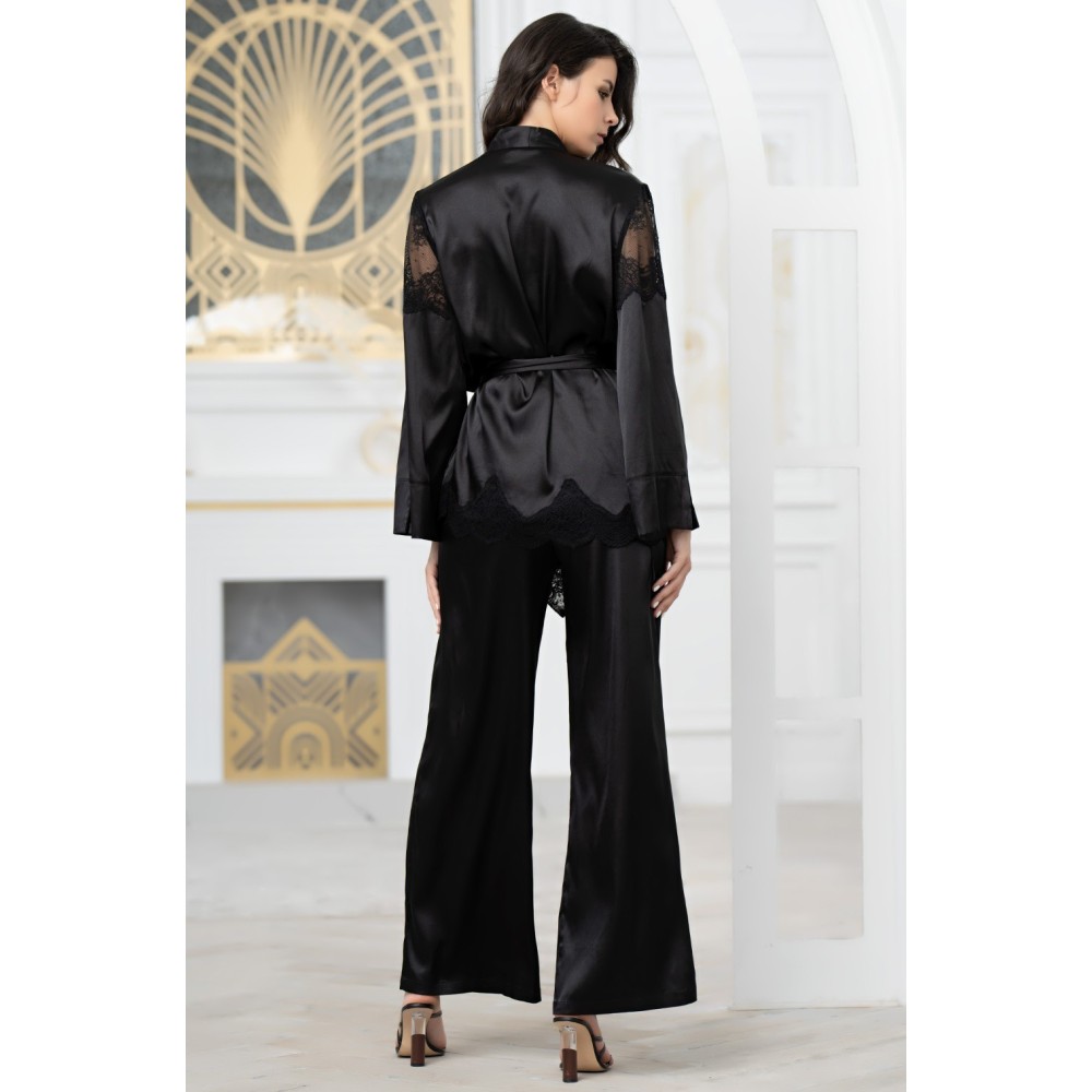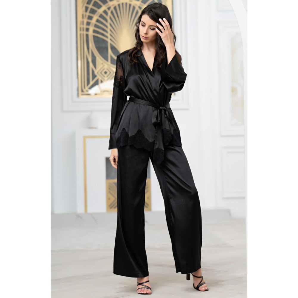 Елегантнийкомплект Аурелія 3896-1 від Mia-Amore - складається з жакета з довгим рукавом,широких штанів і мереживного бралетту, виконаний з сумішевого шовку ідоповнений мереживними вставками. Лінію талії можна підкреслити за рахунокширокого поясу з мереживними вставками.Склад 70%натуральний шовк, 25% поліестер, 5% еластан.