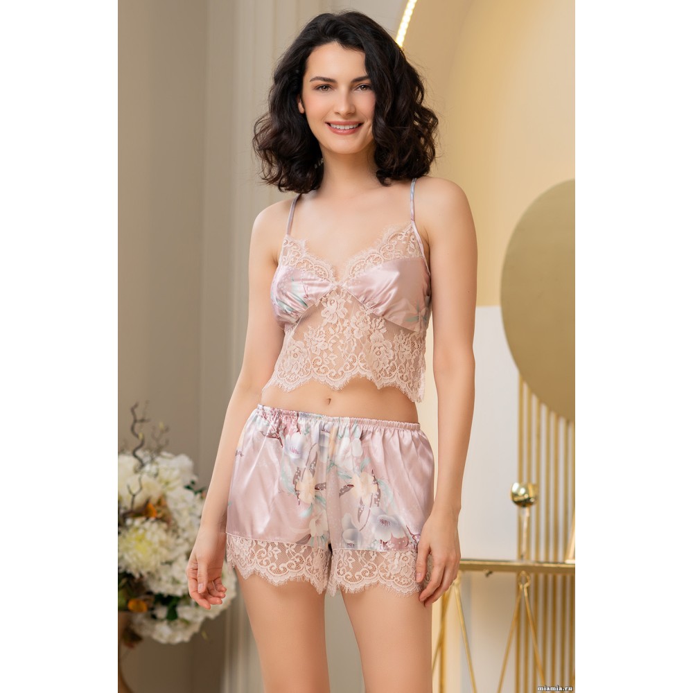 Комплект-трійка Mia-Amore, складається з бралетта, шортів та Запашний жакета з коротким рукавом. Комплект виконаний з принтованого смесового шовку і декорований ажурним мереживом. Декор - атласний бантик з підвіскою по центру вирізу бралетта. Склад 70% натуральний шовк, 25% поліестер, 5% еластан