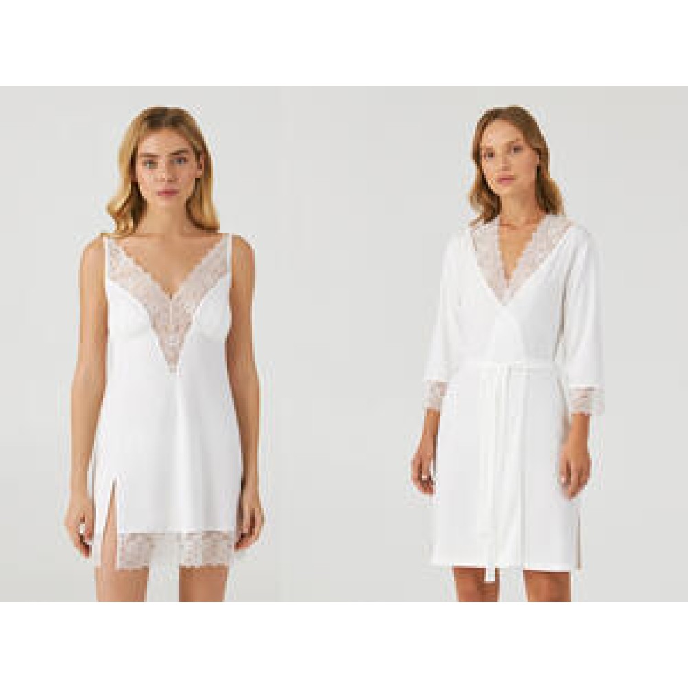 Комплект торгової марки Ellen, що складається з халата з 3/4 рукавом і нічної сорочки на регульованих бретелях, виконаної з гладкої мікрофібри молочного кольору;