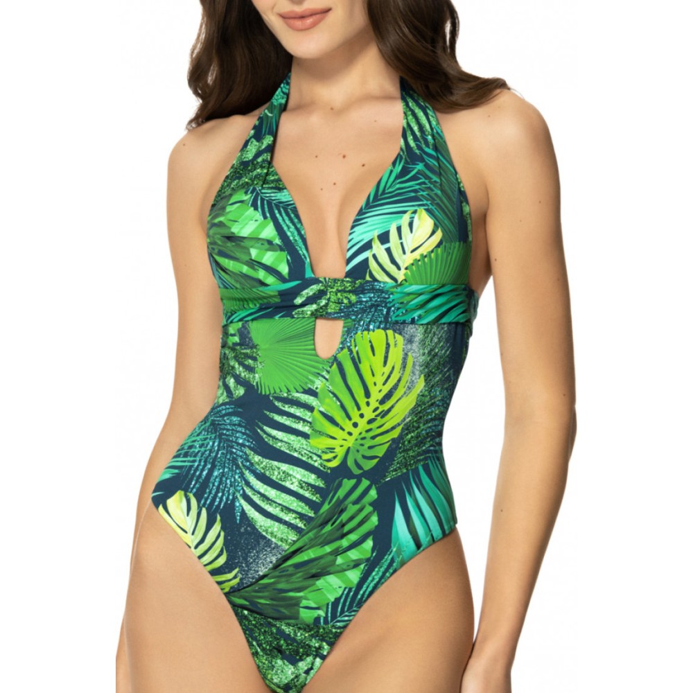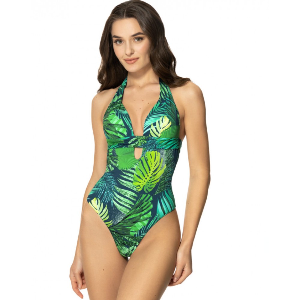 Злитий стильний купальник торгової марки Jasmine на широких бретелях виконаний з мікрофібри, що швидко висихає, зеленого кольору у вигляді пальмового листя різних відтінків зеленого кольору;