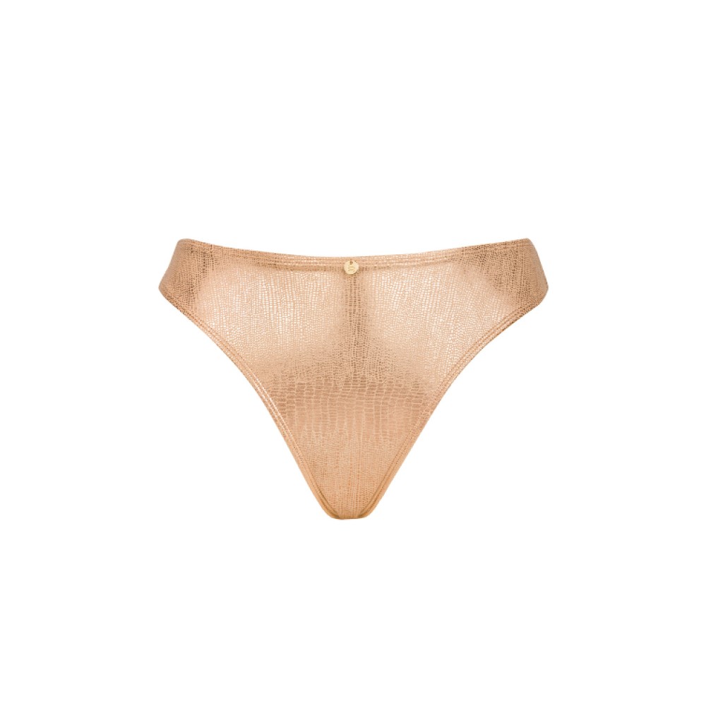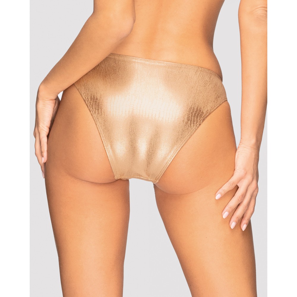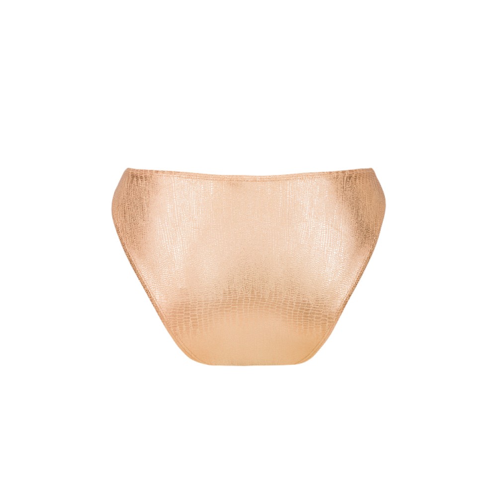 Золотые женские плавки-бикини с принтом змеиной кожи на подкладке.
